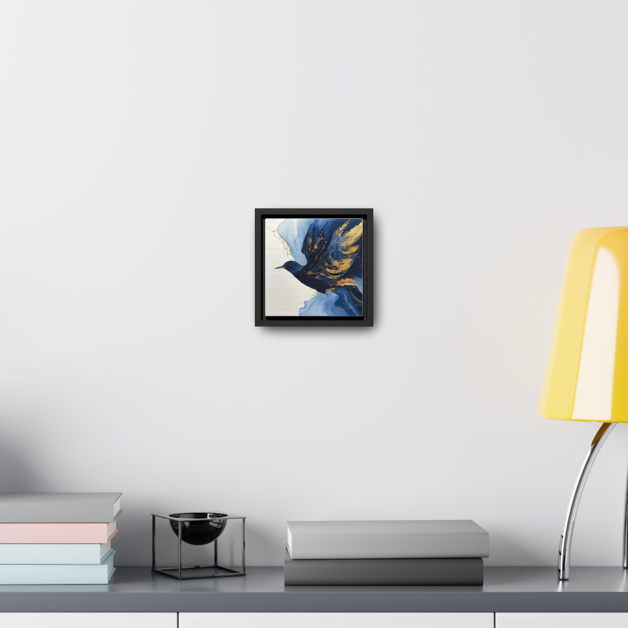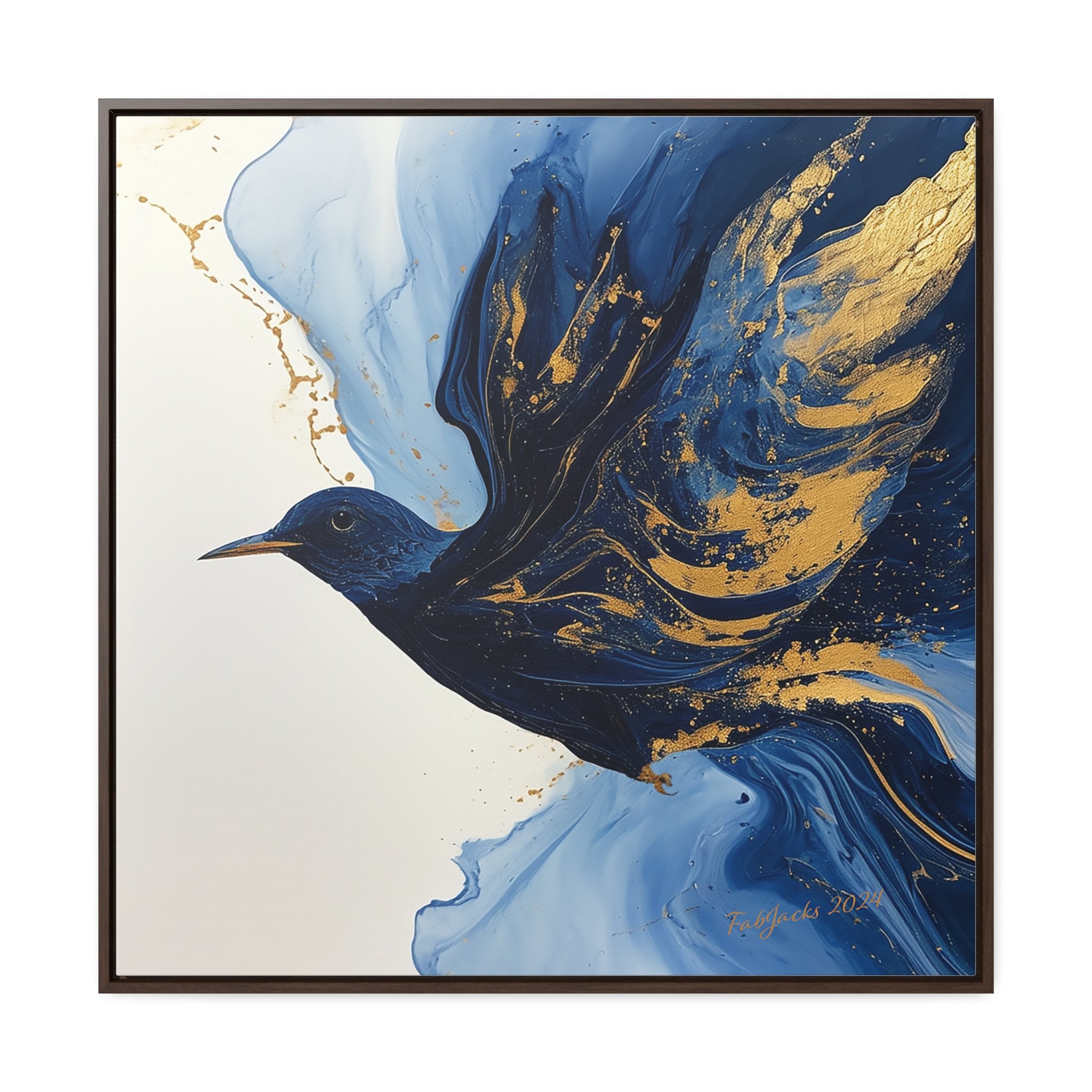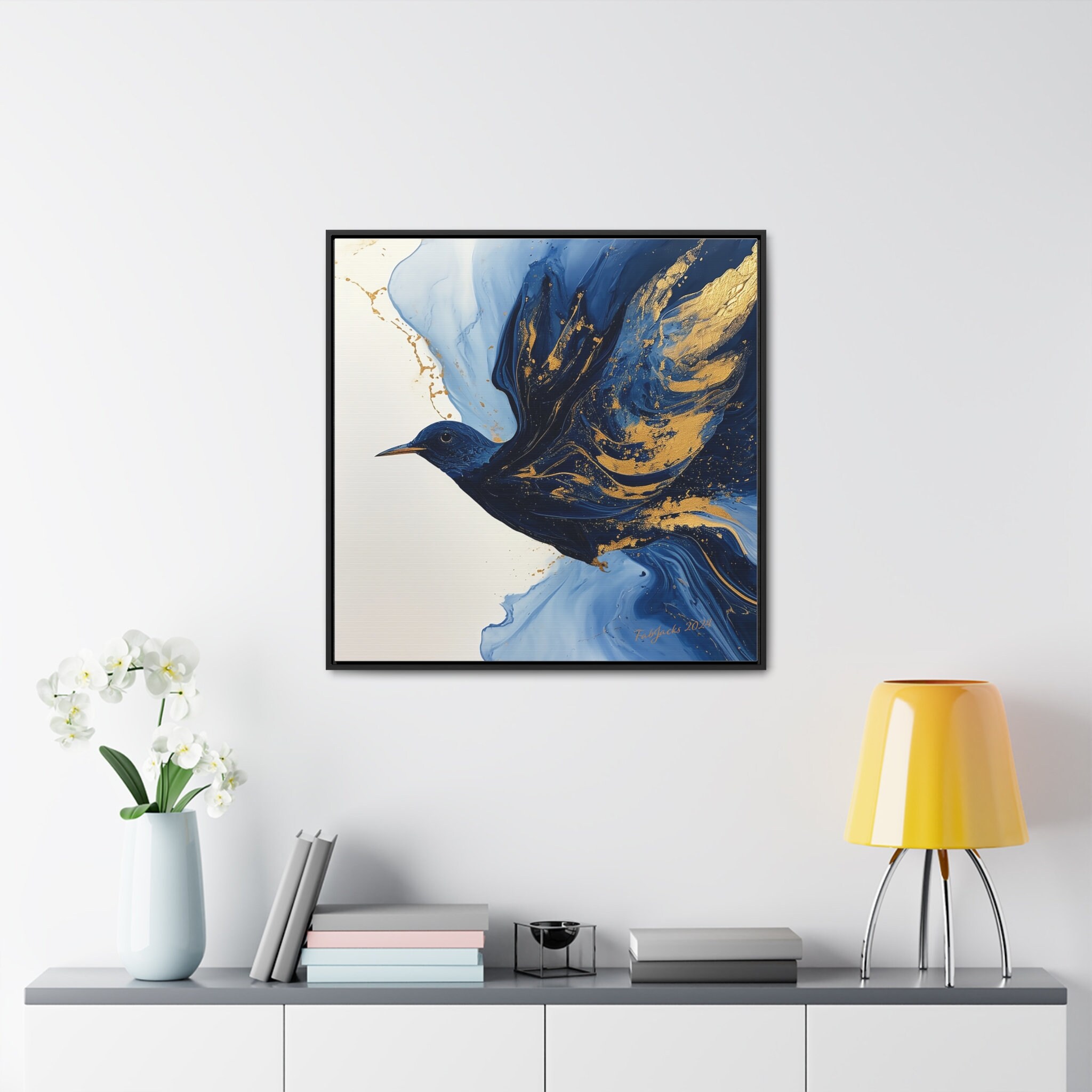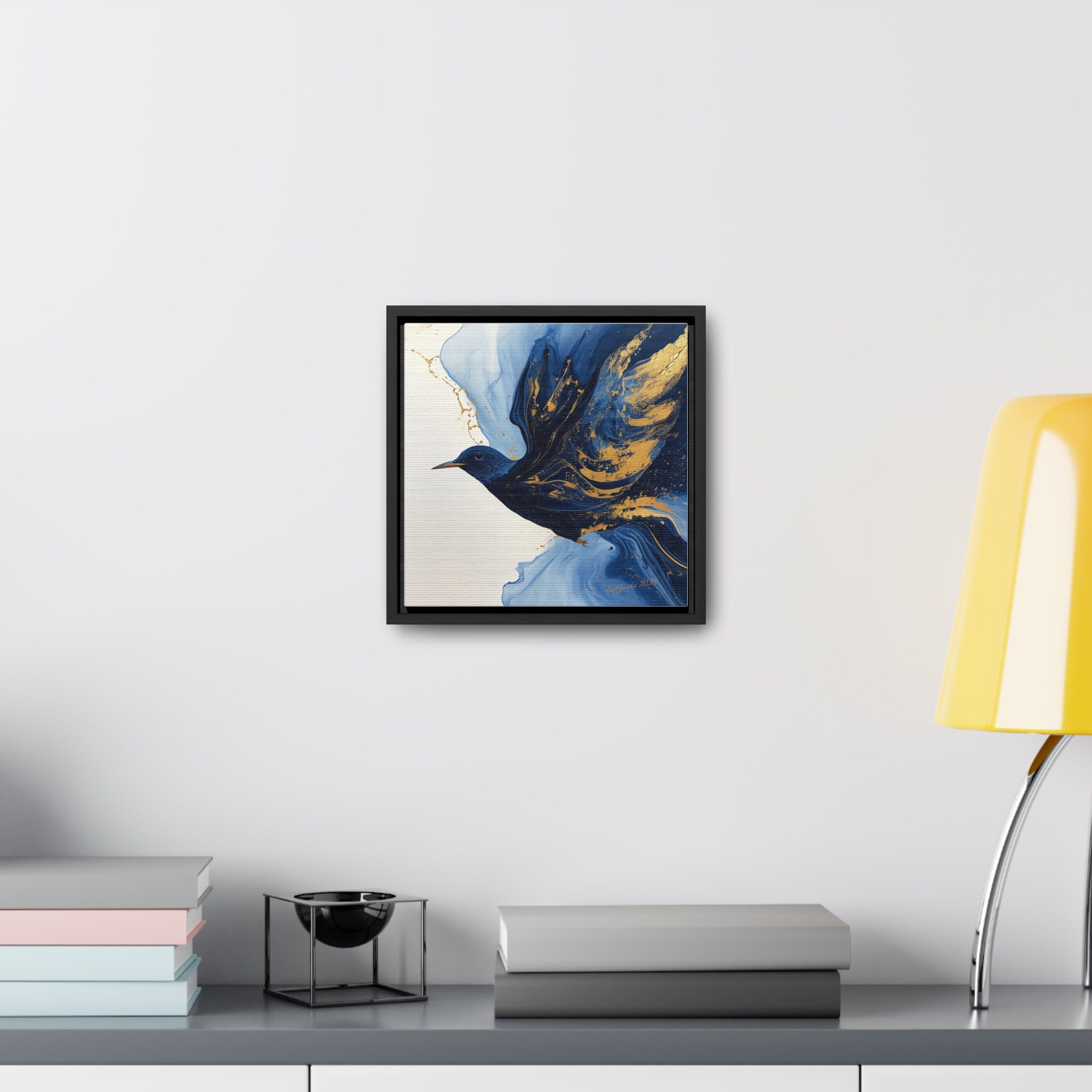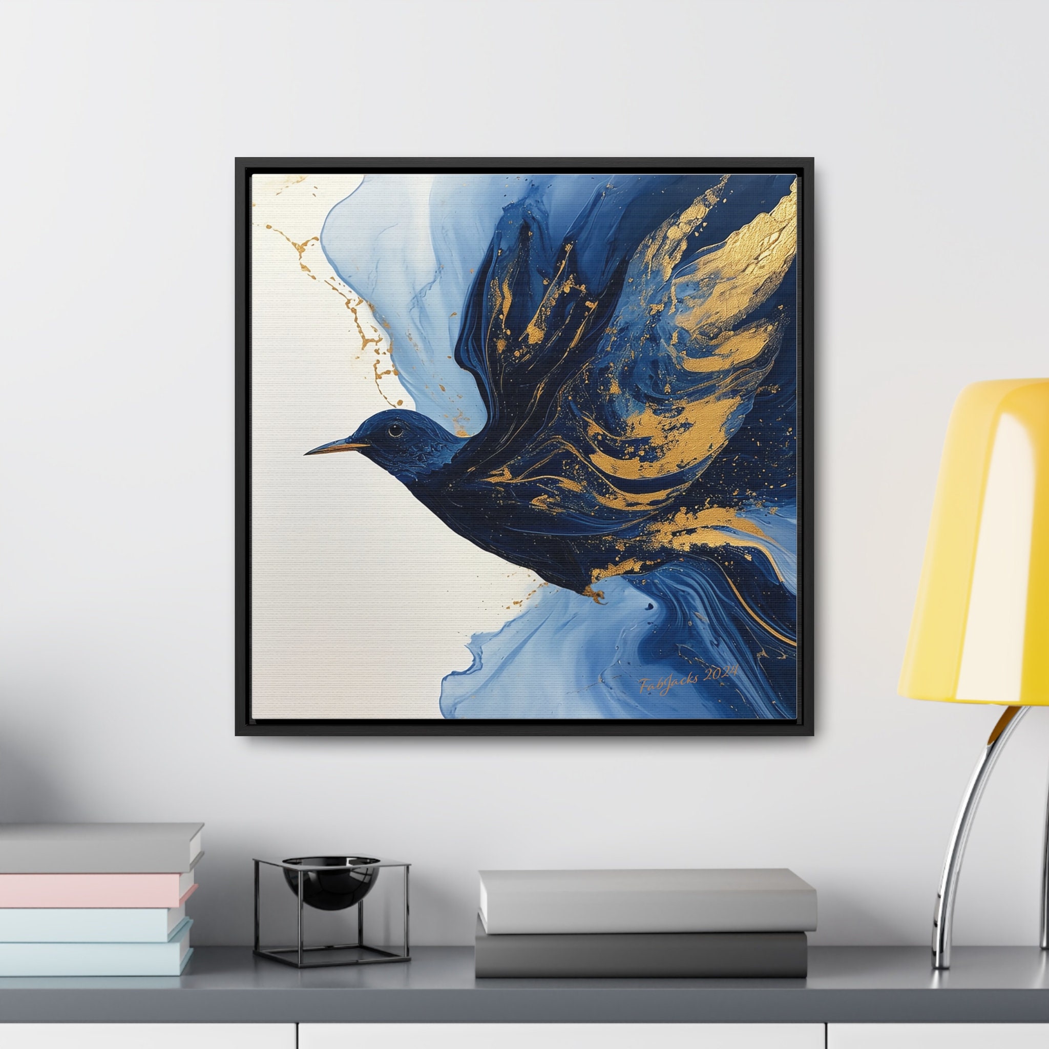 Skyward Framed Canvas: original art in shades of blue with golden accents printed on high quality home decor. Great gift for bird lovers.