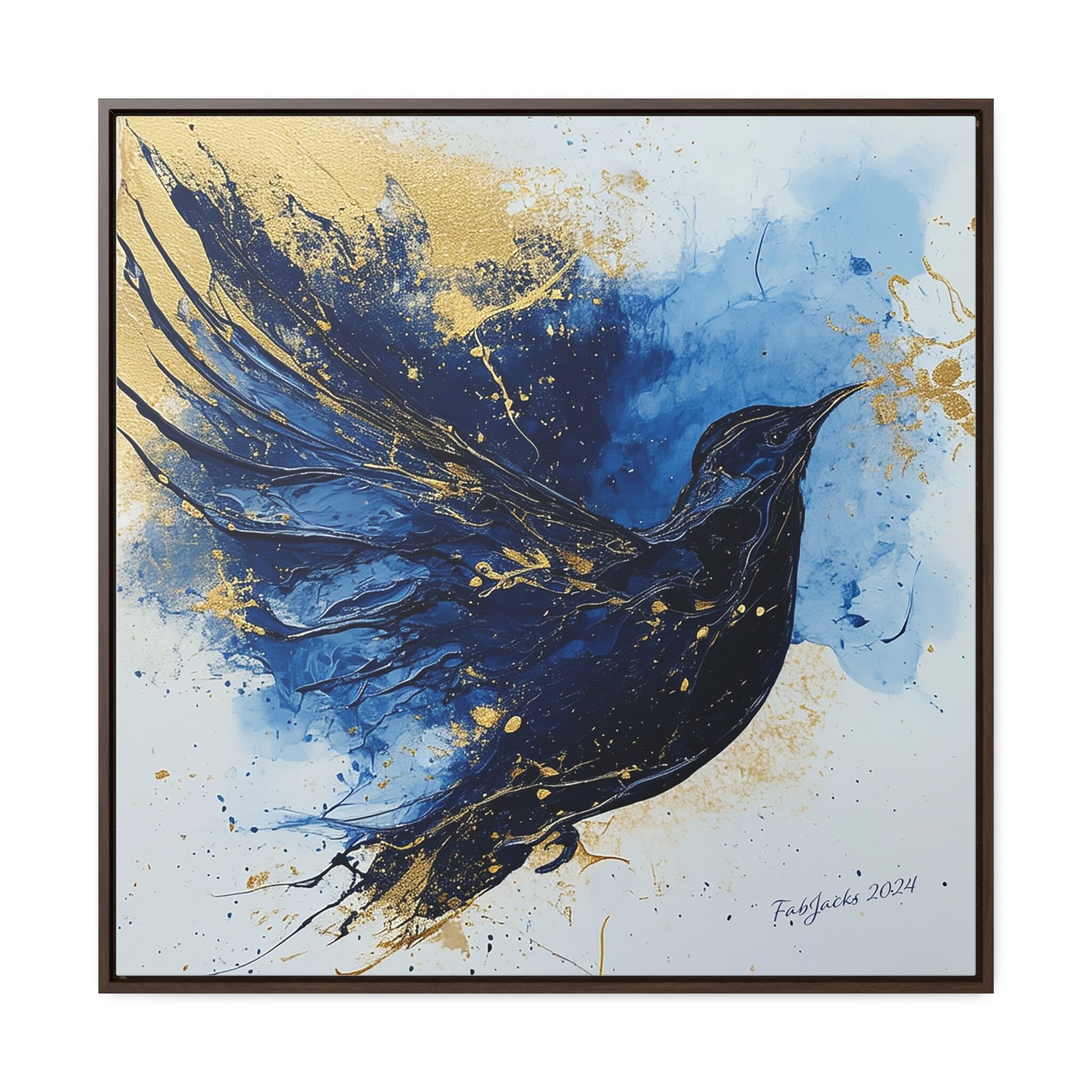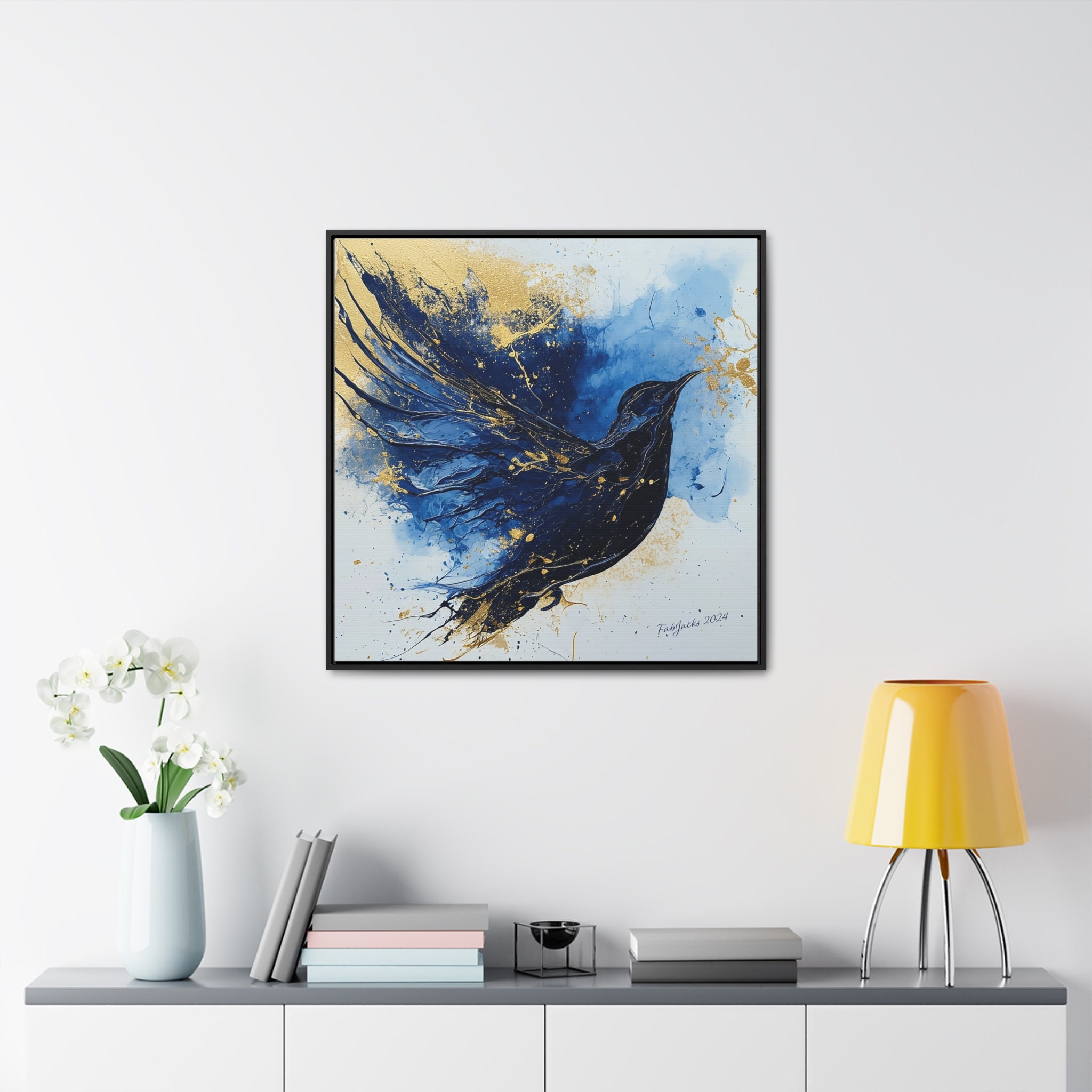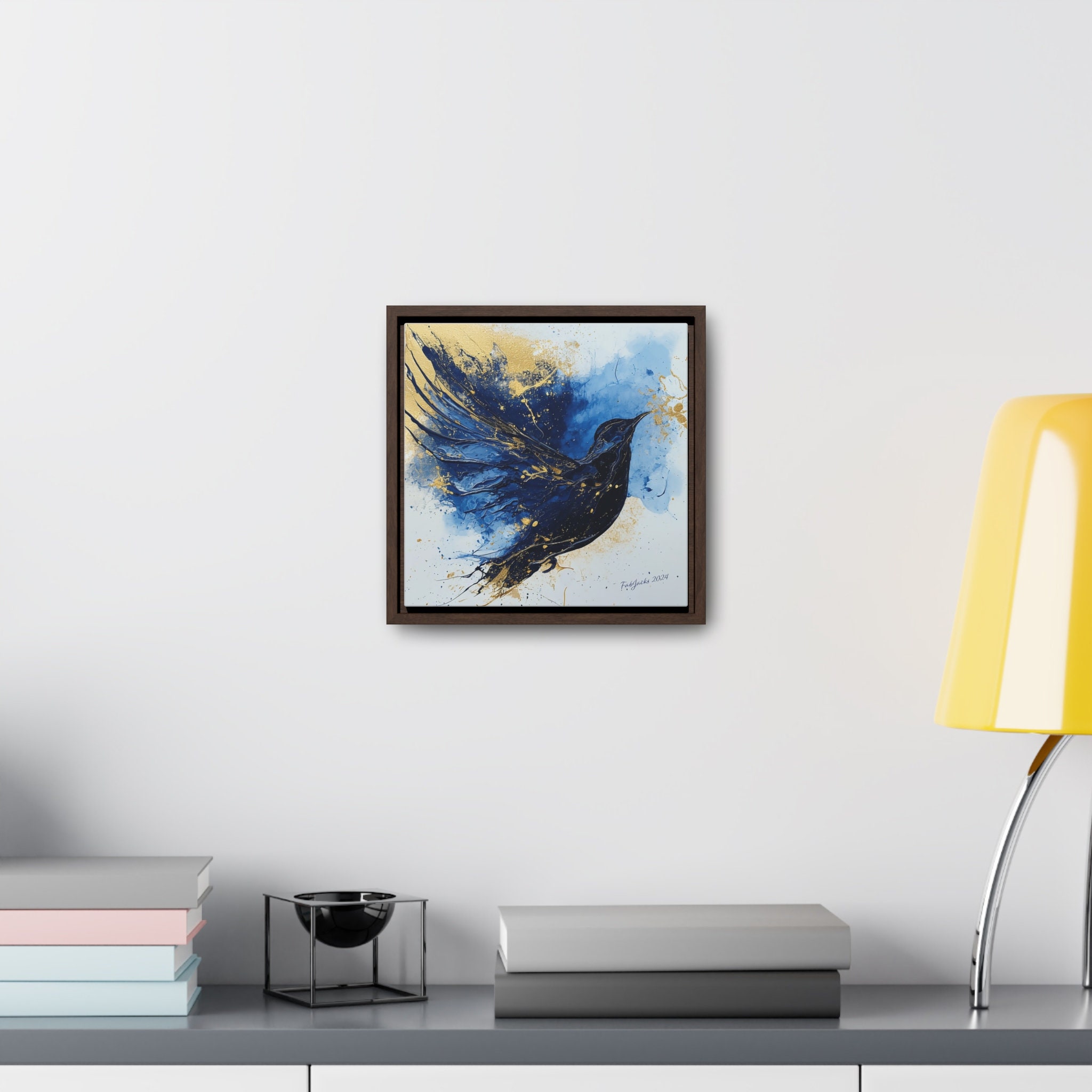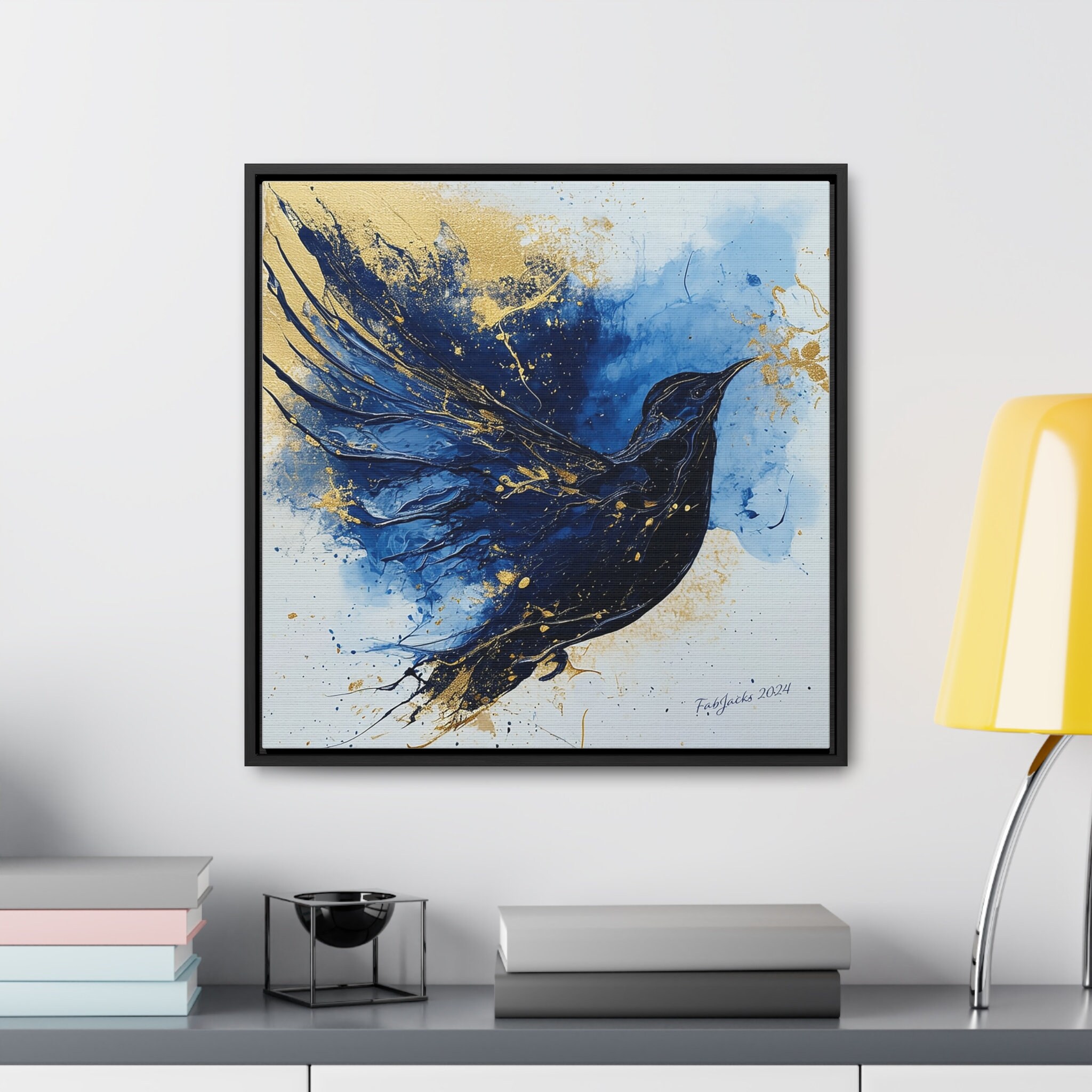 Symphony Framed Canvas: original art in shades of blue with golden accents printed on high quality home decor. Great gift for bird lovers.
