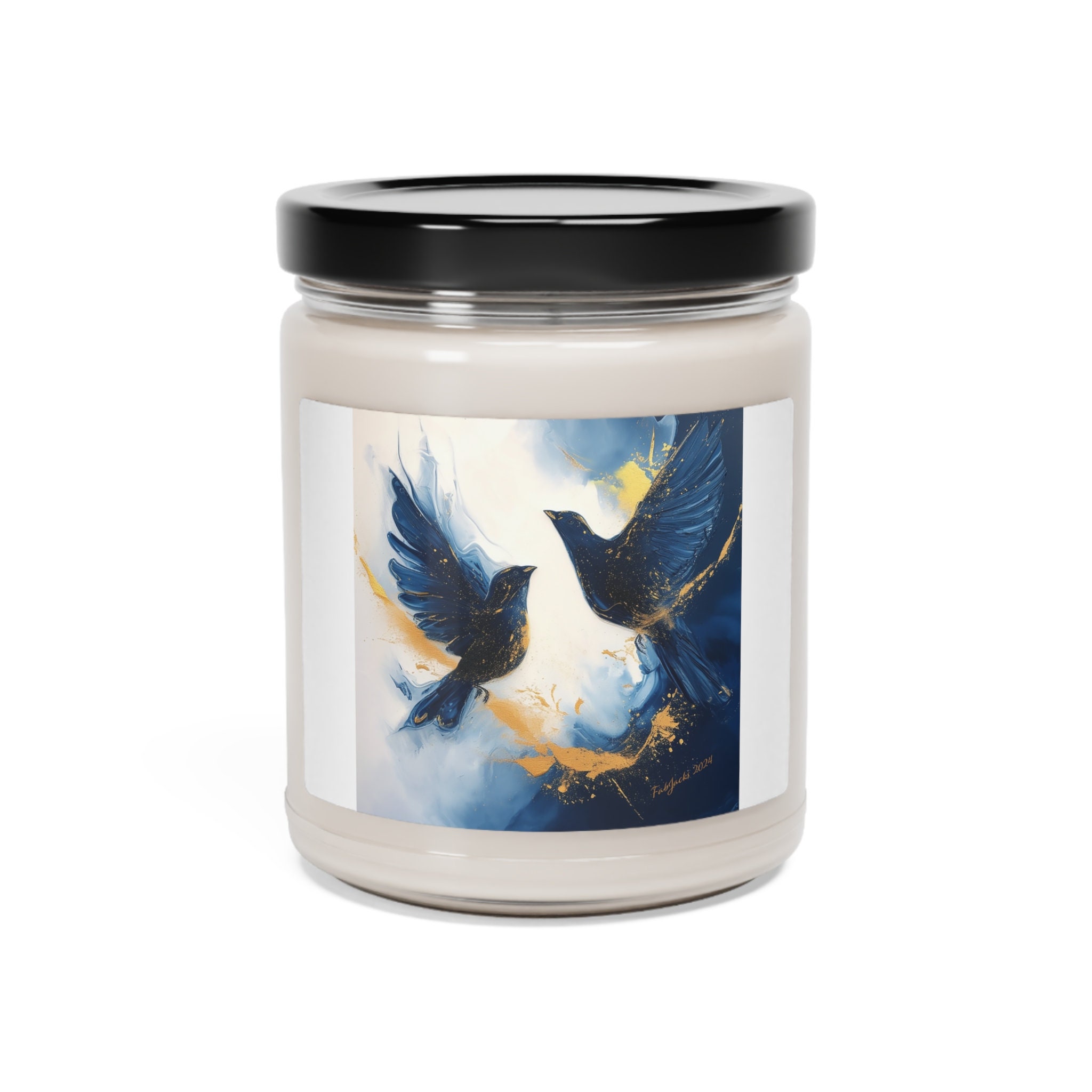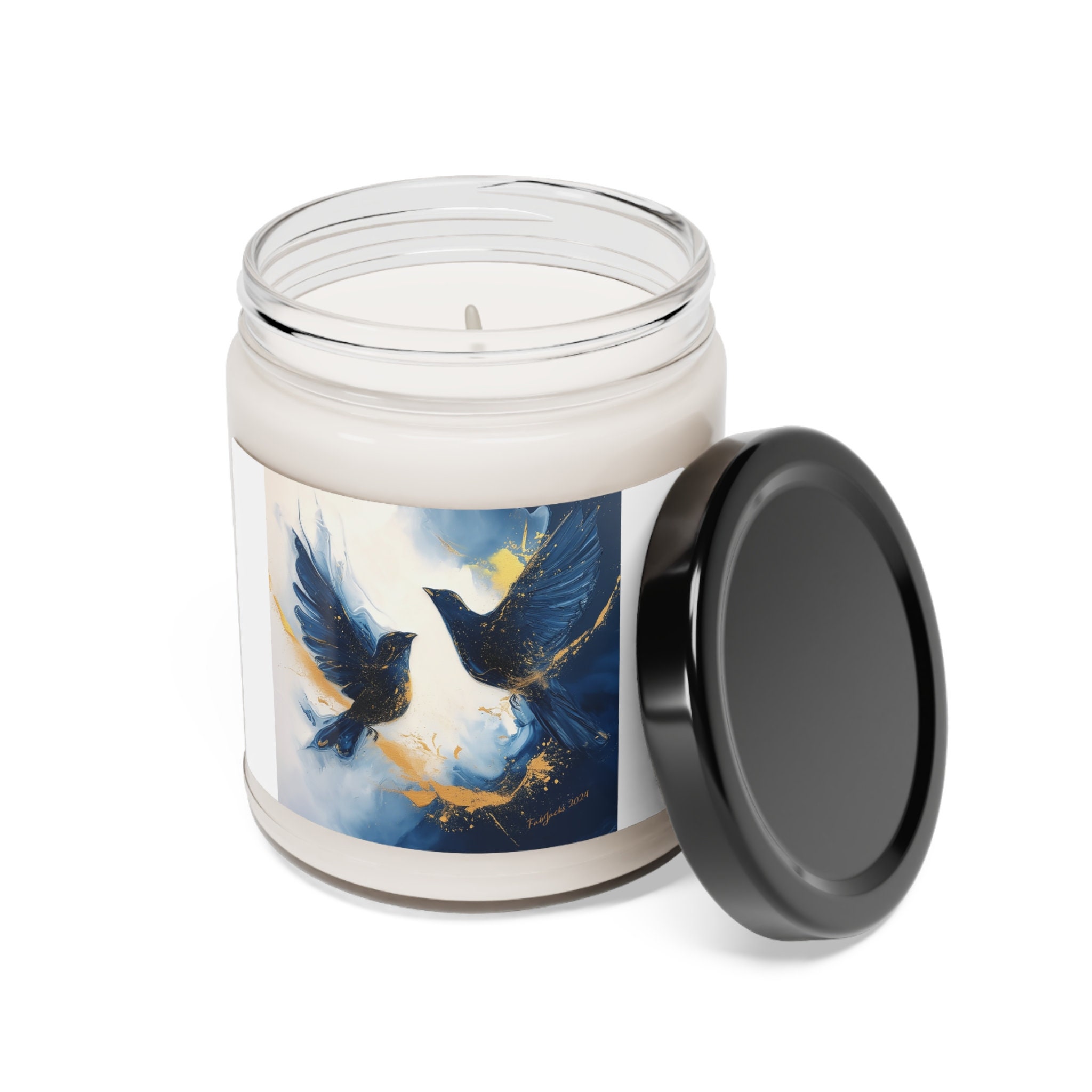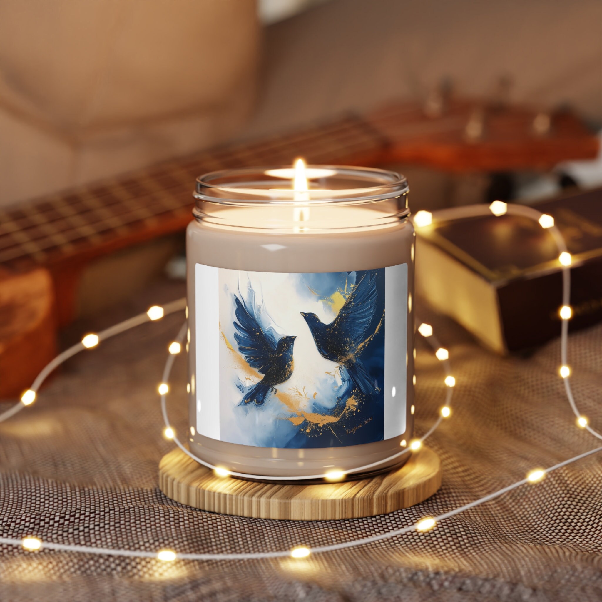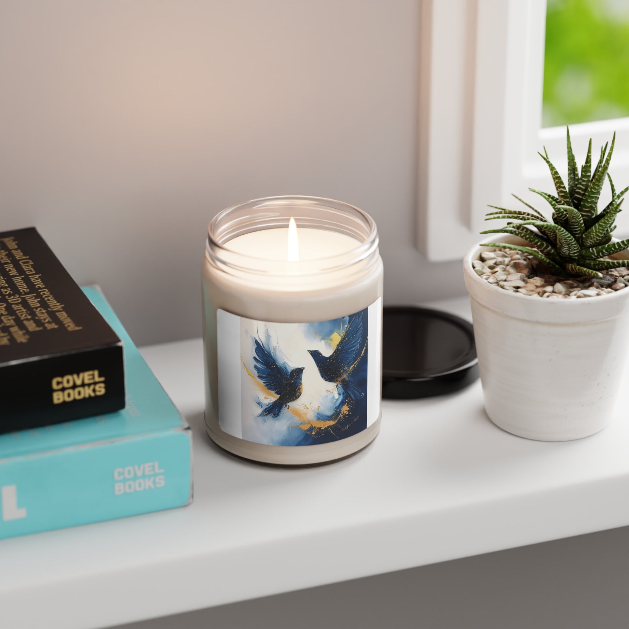 Skyward Symphony Scented Soy Candle: original art in blue with golden accents printed on high quality home decor. Great gift for bird lovers