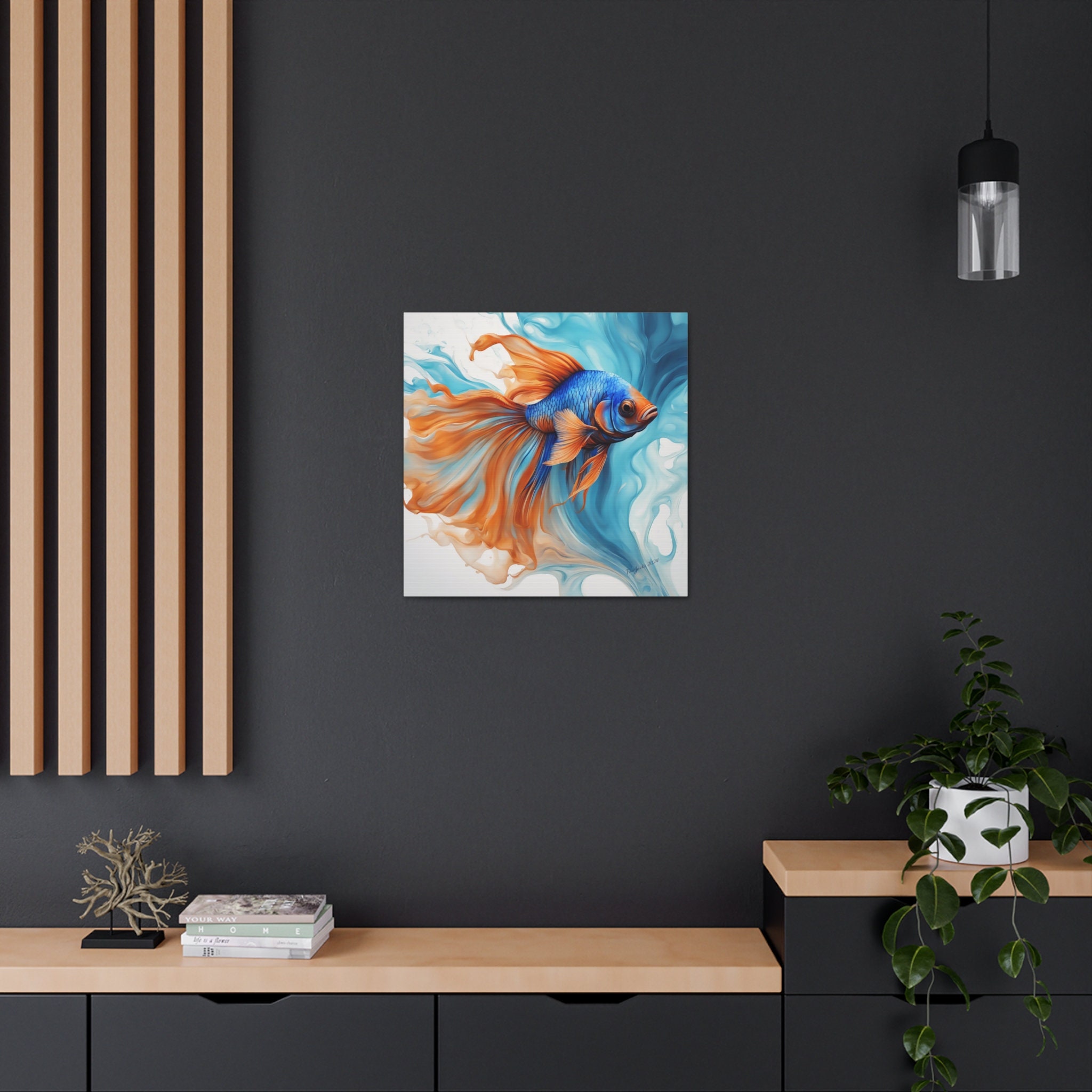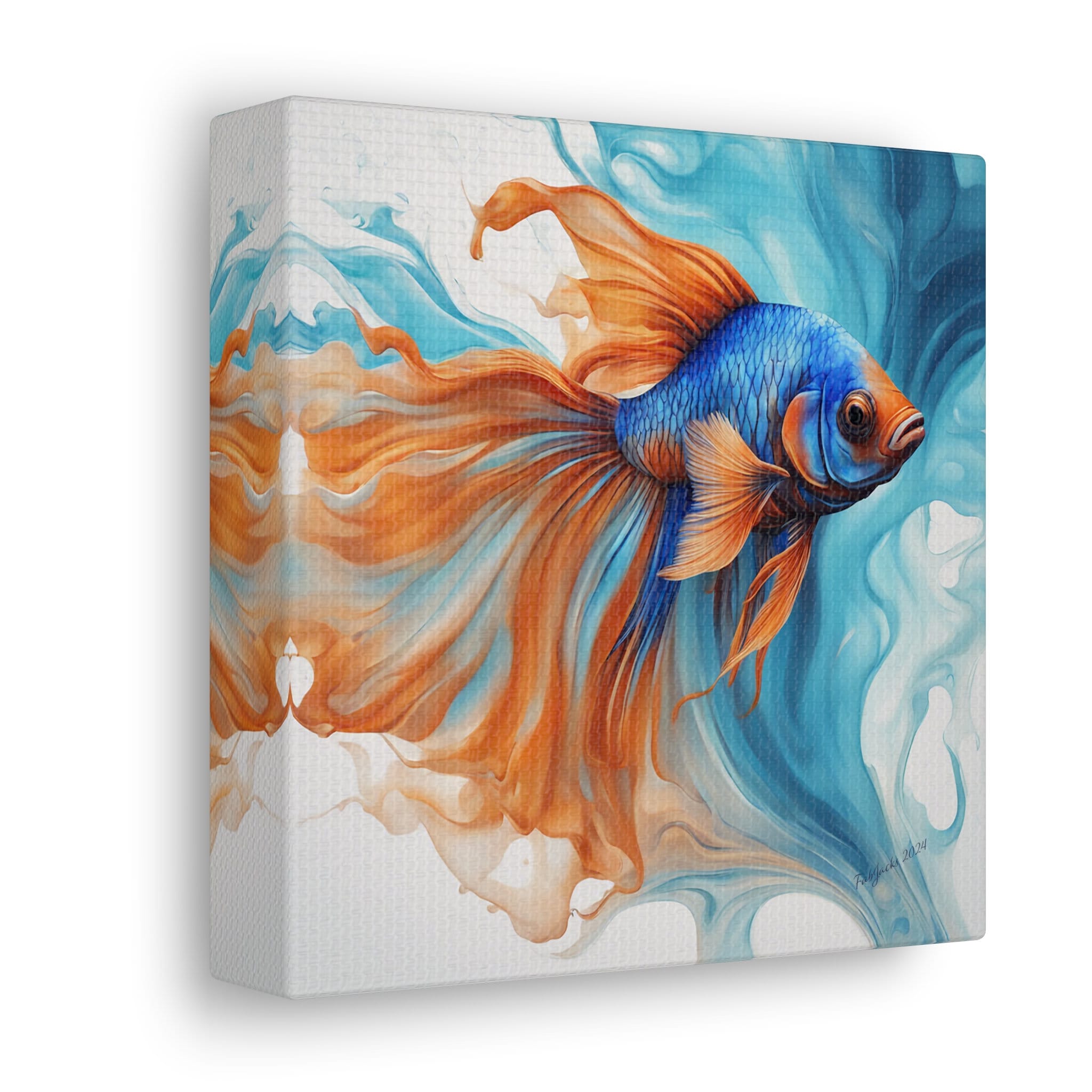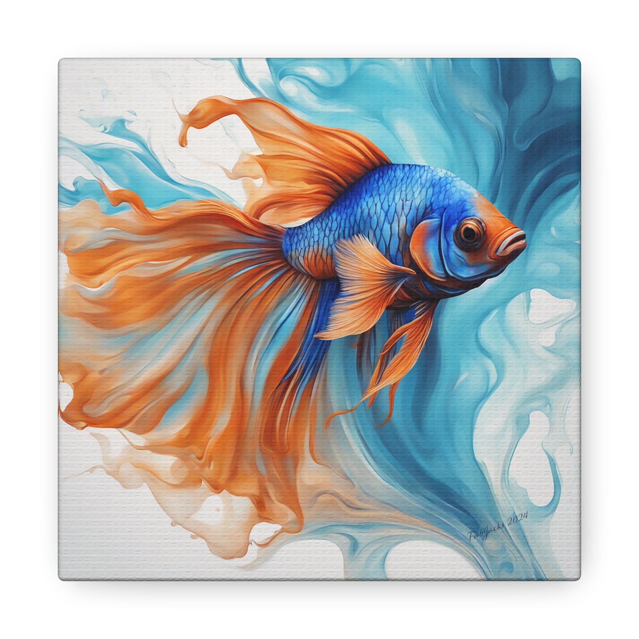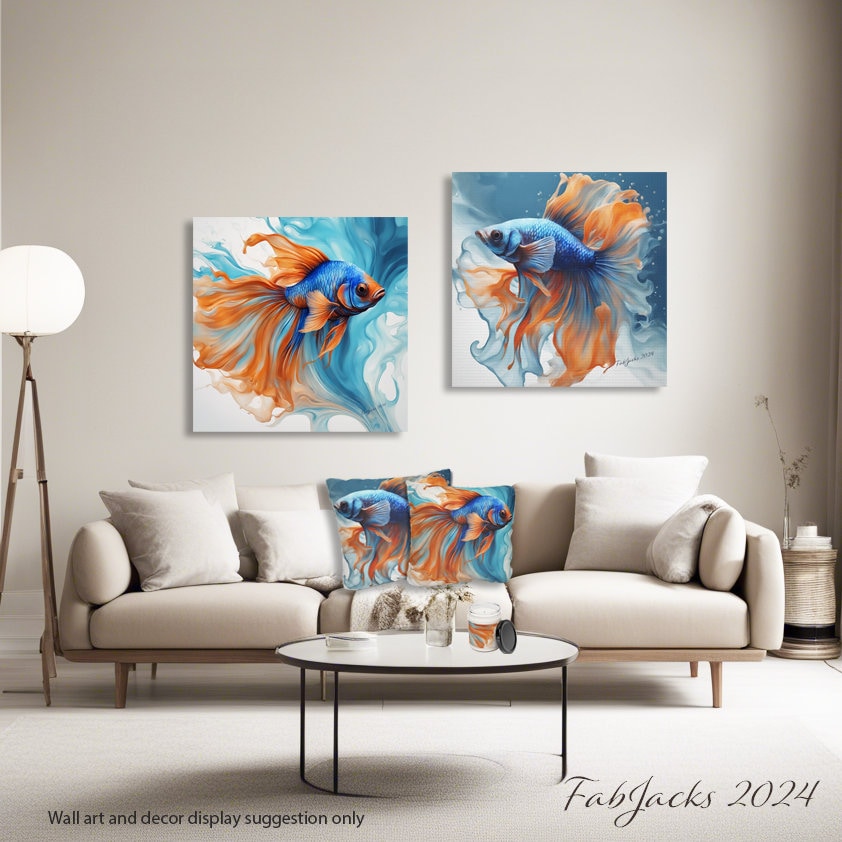 Dive into a world of vibrant hues and fluid elegance inspired by the mesmerizing beauty of blue and orange Beta fish. Uplift any room's decor with art that's printed on top-quality canvas gallery wraps. Each wrap is made with finely textured, artist-grade cotton substrate which displays the art in outstanding clarity and detail. Available in multiple sizes, these closed back canvases are built with a patented, solid support face and are excellent for indoor use.