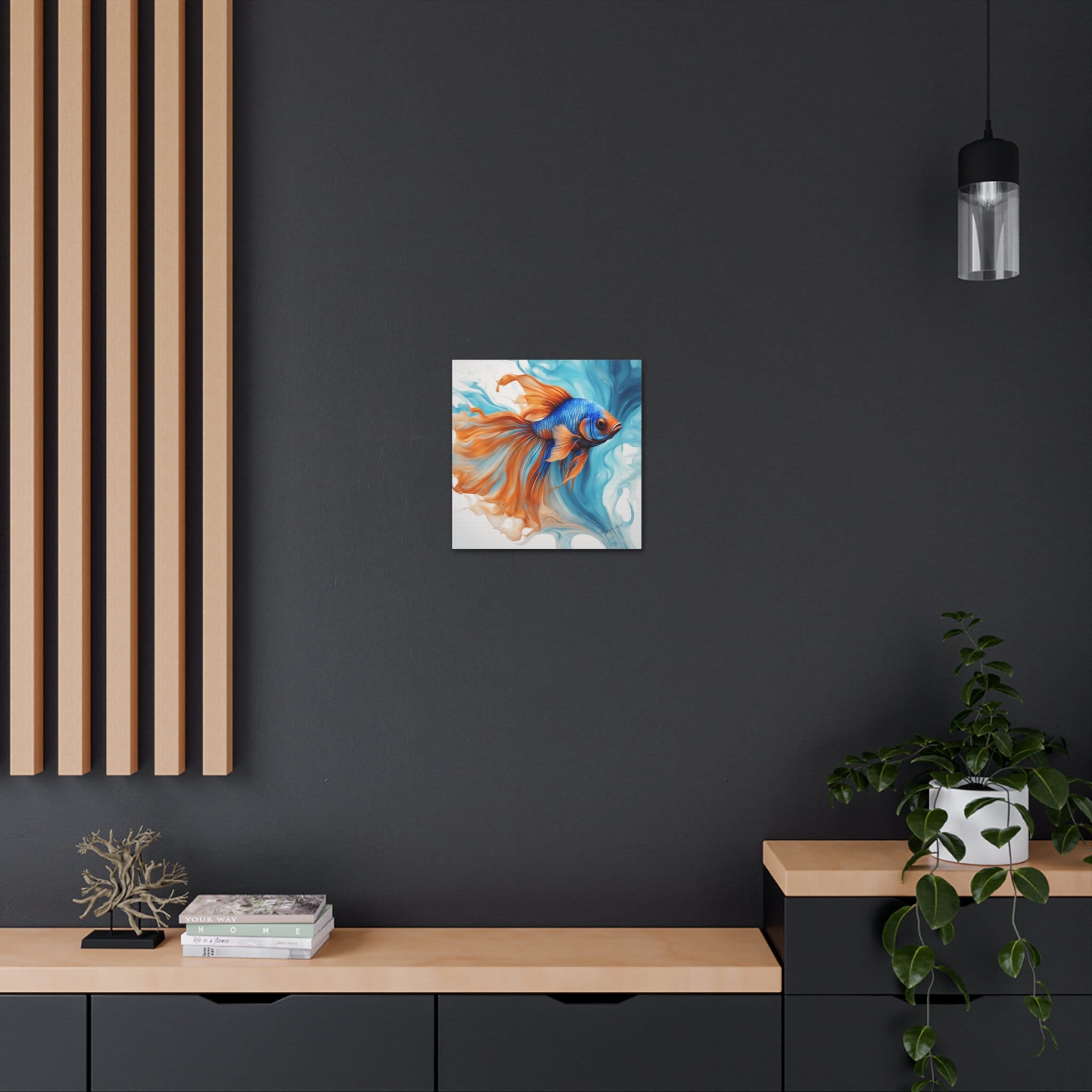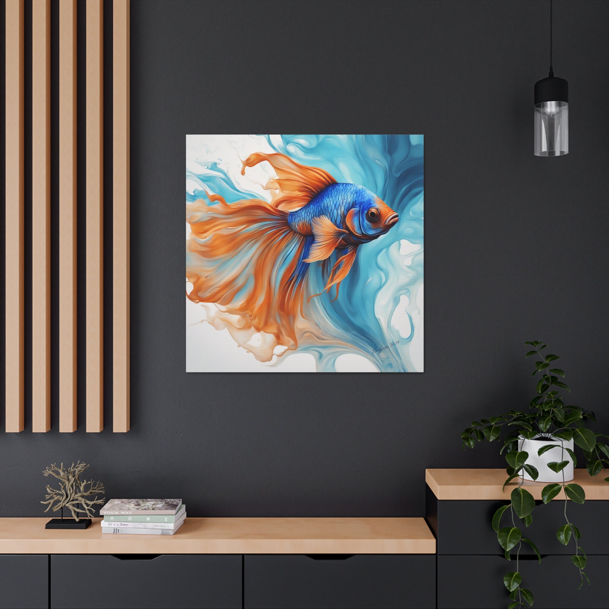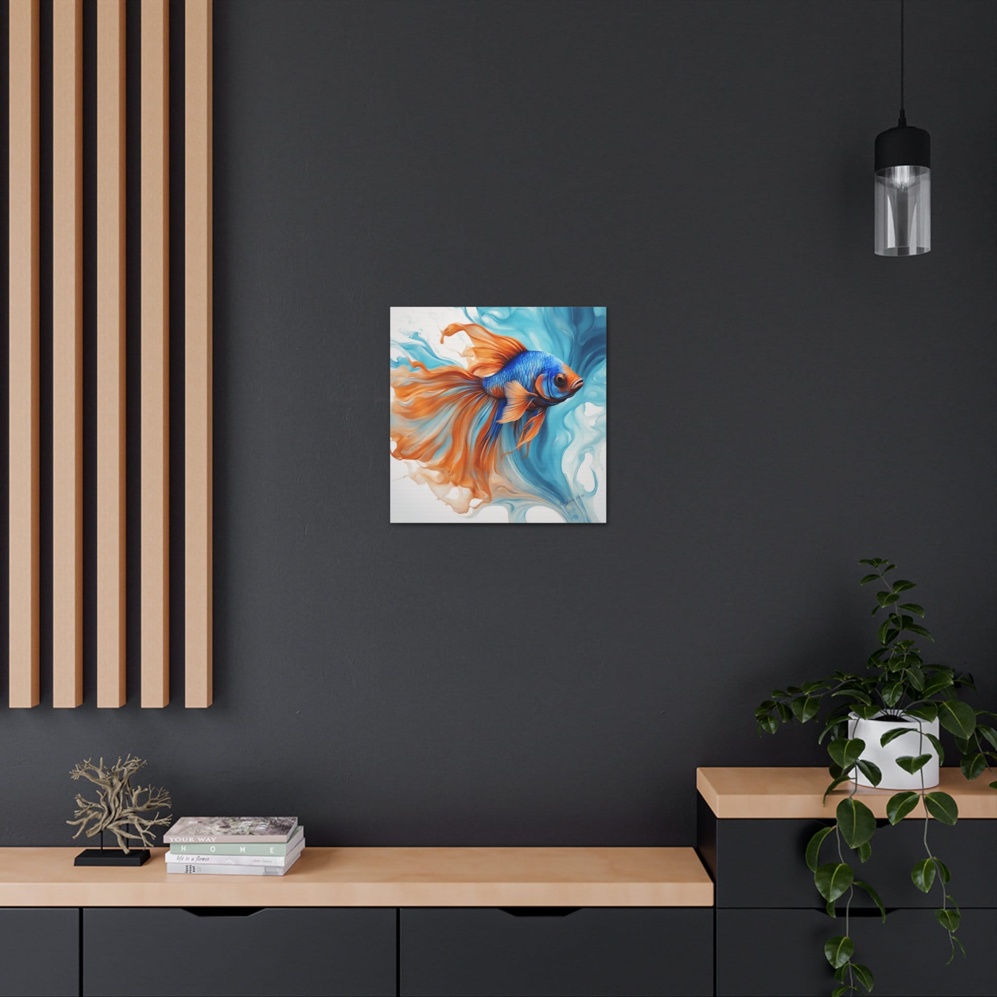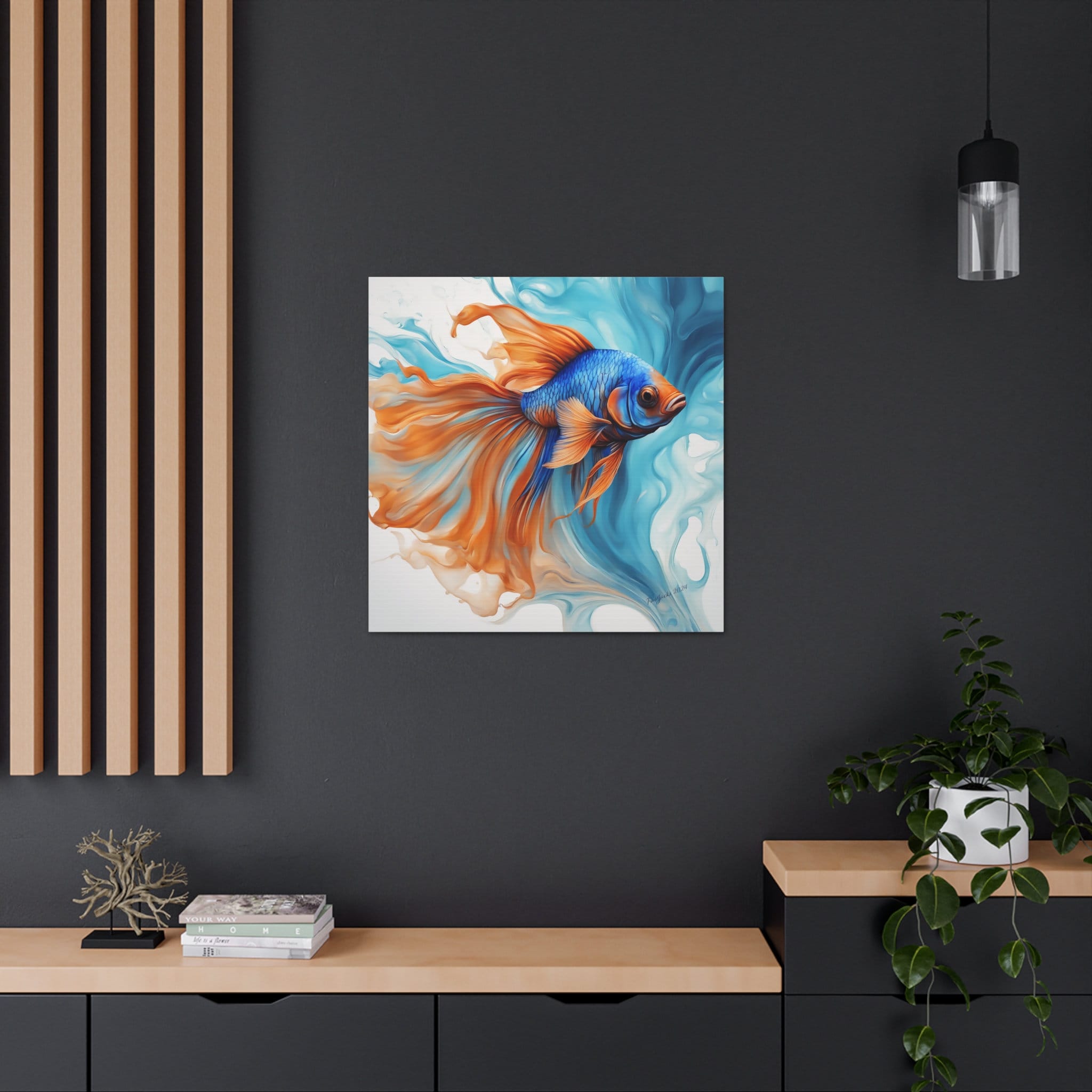 Dive into a world of vibrant hues and fluid elegance inspired by the mesmerizing beauty of blue and orange Beta fish. Uplift any room's decor with art that's printed on top-quality canvas gallery wraps. Each wrap is made with finely textured, artist-grade cotton substrate which displays the art in outstanding clarity and detail. Available in multiple sizes, these closed back canvases are built with a patented, solid support face and are excellent for indoor use.