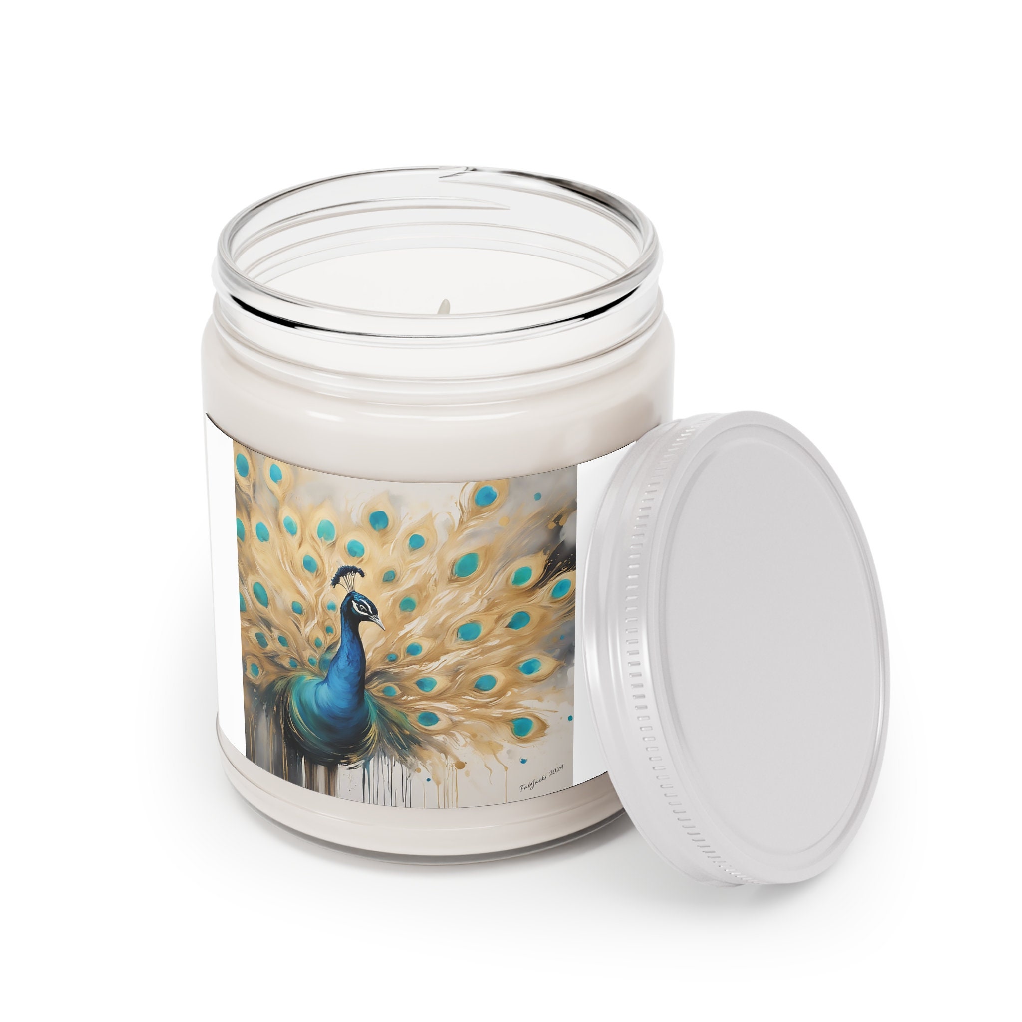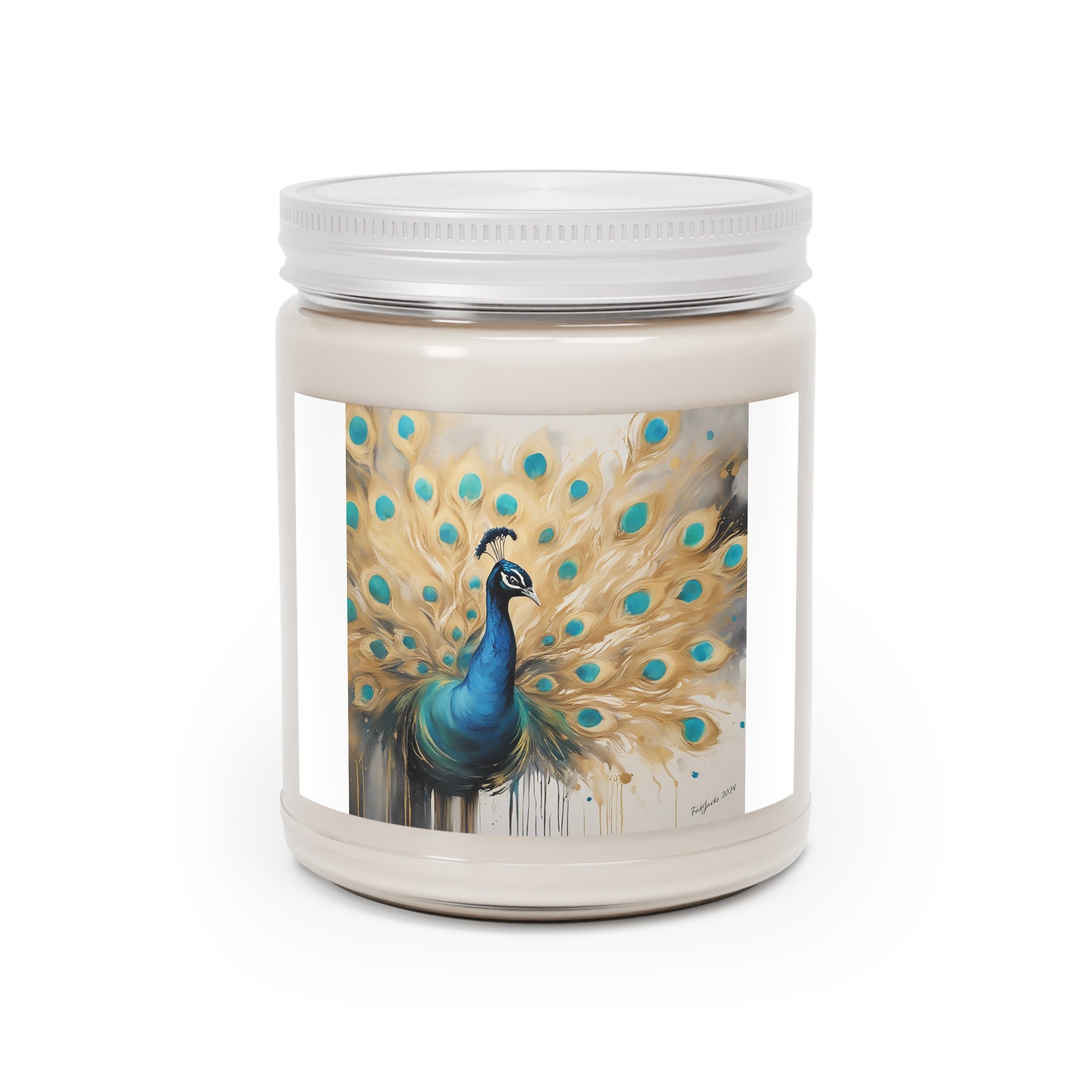 Ethereal Plumage Scented Candle, original abstract peacock fluid art printed on high quality home decor. Great as a gift