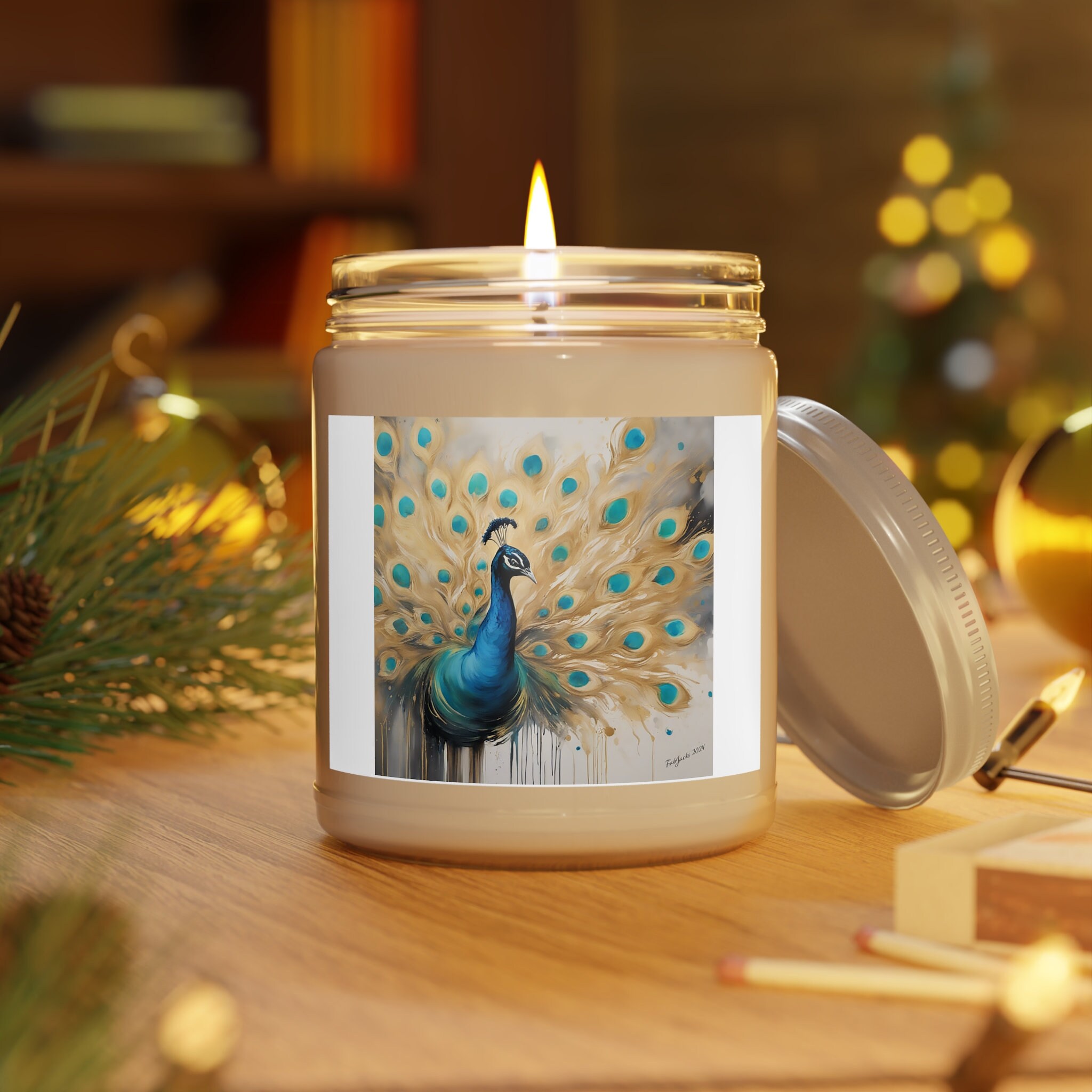 Ethereal Plumage captures the essence of a peacock's magnificence through an explosion of vibrant hues and dynamic brushstrokes. The canvas dances with rich blues, emerald greens, and shimmering golds, echoing the mesmerizing display of the peacock's iridescent feathers. Made to soothe long and stressful days! The candle itself is made 100% with a natural soy wax blend and cotton wick. Choose between fragrances such as Vanilla Bean, Comfort Spice, Sea Breeze, Unscented, Fresh Balsam, Spiced Pumpkin Ginger, Pink Grapefruit and Eucalyptus Lavender Herb.