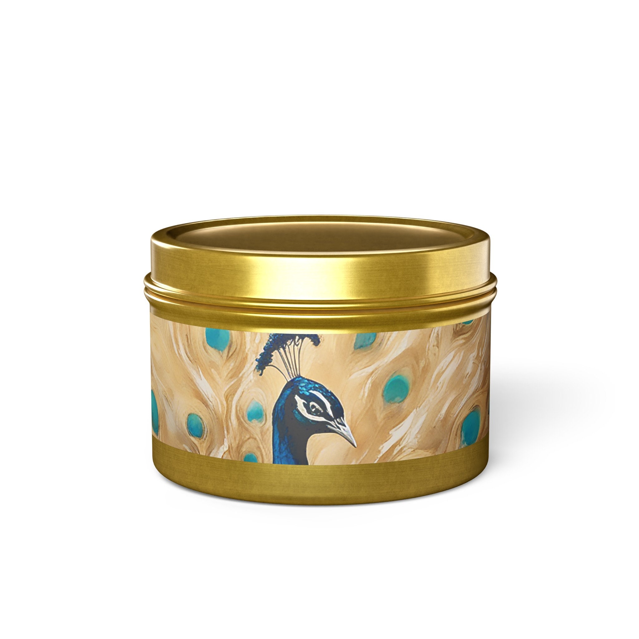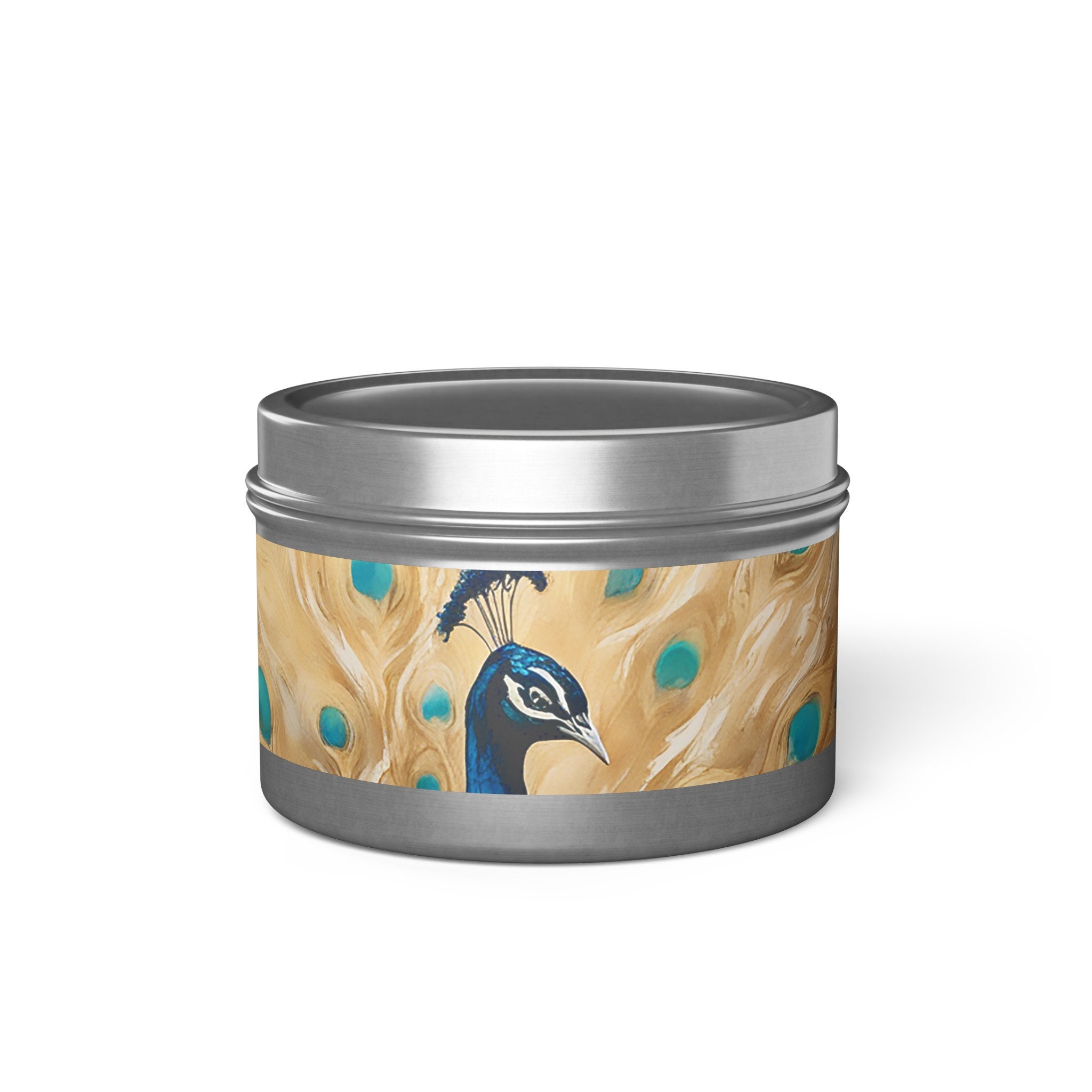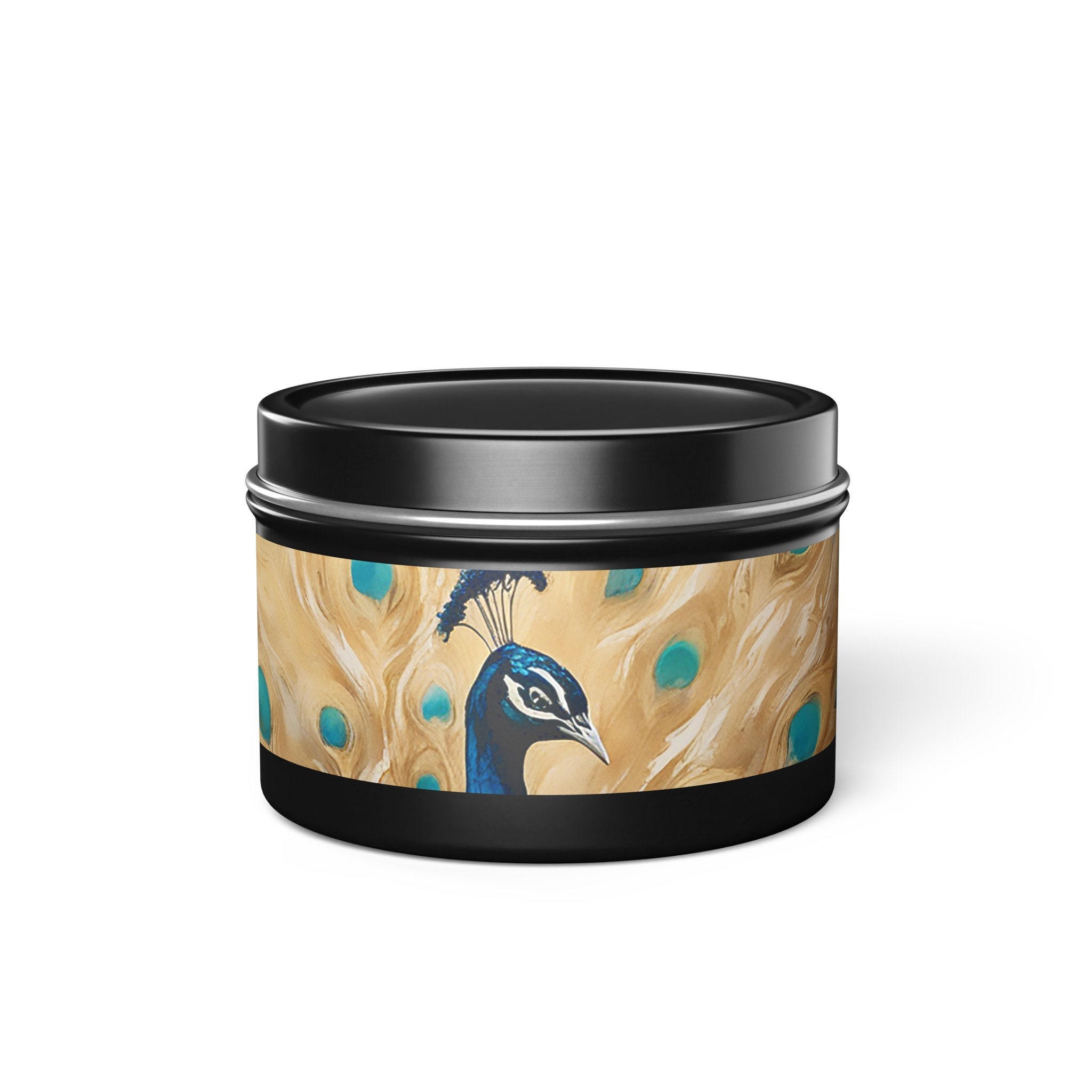 Ethereal Plumage captures the essence of a peacock's magnificence through an explosion of vibrant hues and dynamic brushstrokes. The canvas dances with rich blues, emerald greens, and shimmering golds, echoing the mesmerizing display of the peacock's iridescent feathers.Create a treat for aromatherapy enthusiasts with these custom tin candles. Available in 4oz and 8oz tins, these candles come natural coconut soy wax that is made and hand-poured in the USA. All candles feature a lead and zinc-free cotton wick with an average burning time of 20 hours (4oz) and 40h (8oz). Choose between 5 captivating aromas: evergreen, fresh coffee, mango coconut, spa retreat, or vanilla bean, and 3 tin colors: gold, silver, or black.