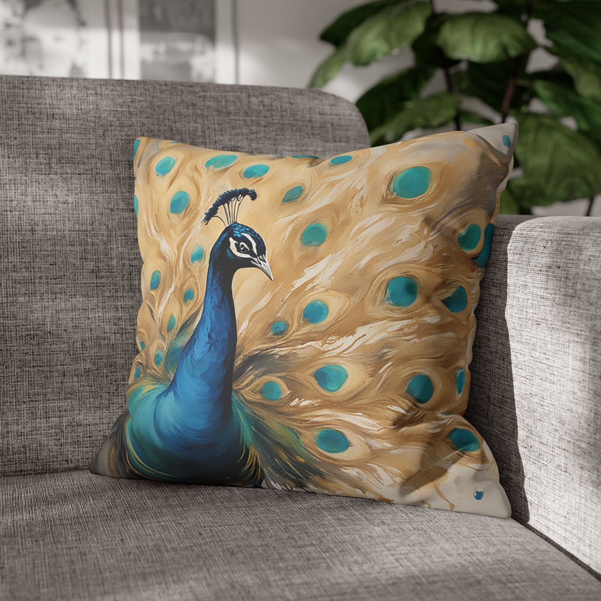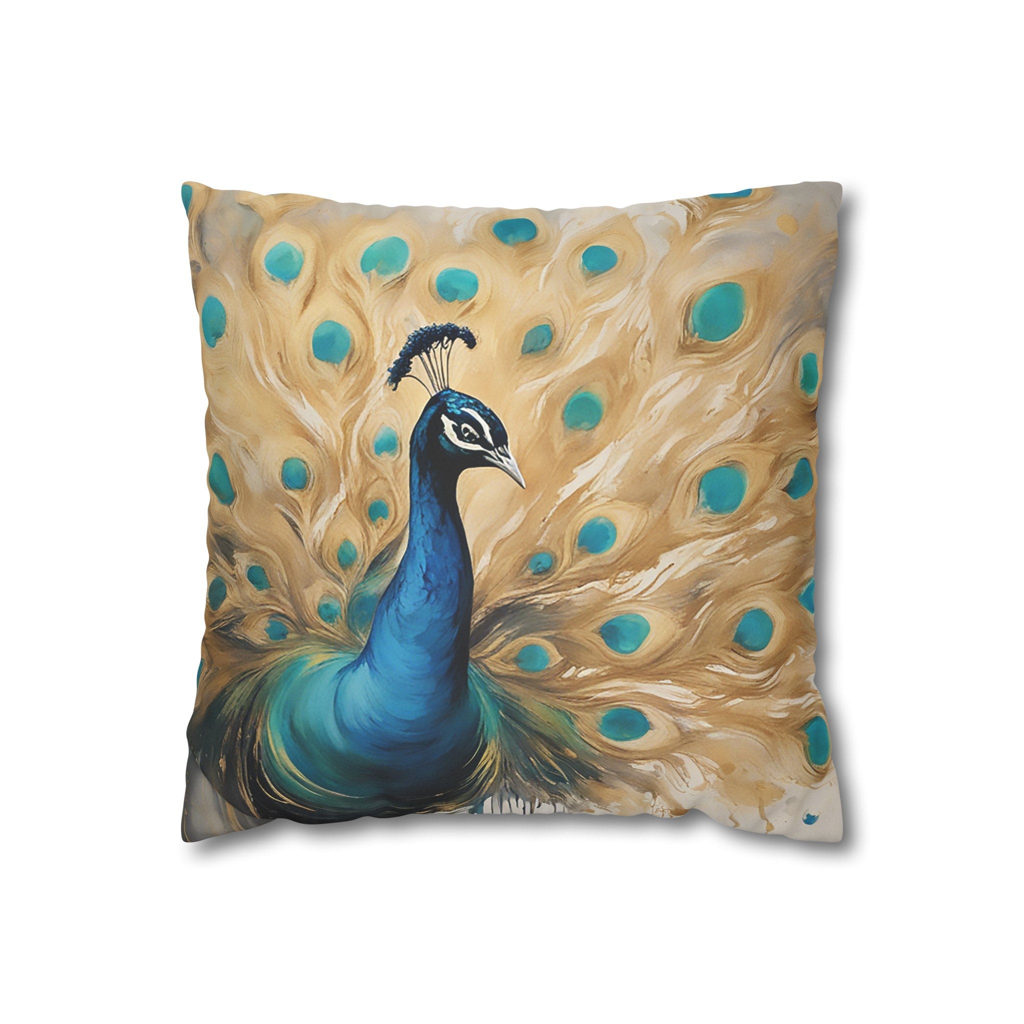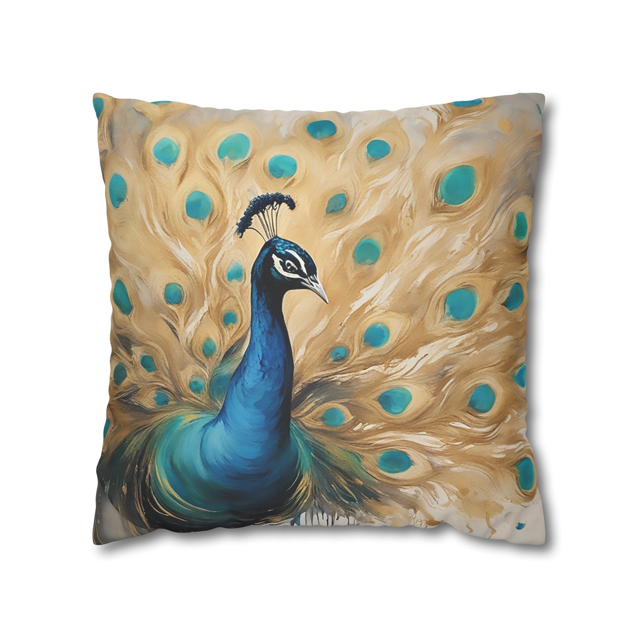 Ethereal Plumage captures the essence of a peacock's magnificence through an explosion of vibrant hues and dynamic brushstrokes. The canvas dances with rich blues, emerald greens, and shimmering golds, echoing the mesmerizing display of the peacock's iridescent feathers.Create a great atmosphere in every room! These highly practical beautiful indoor pillowcases serve as statement pieces, printed on both sides, creating a personalized environment.