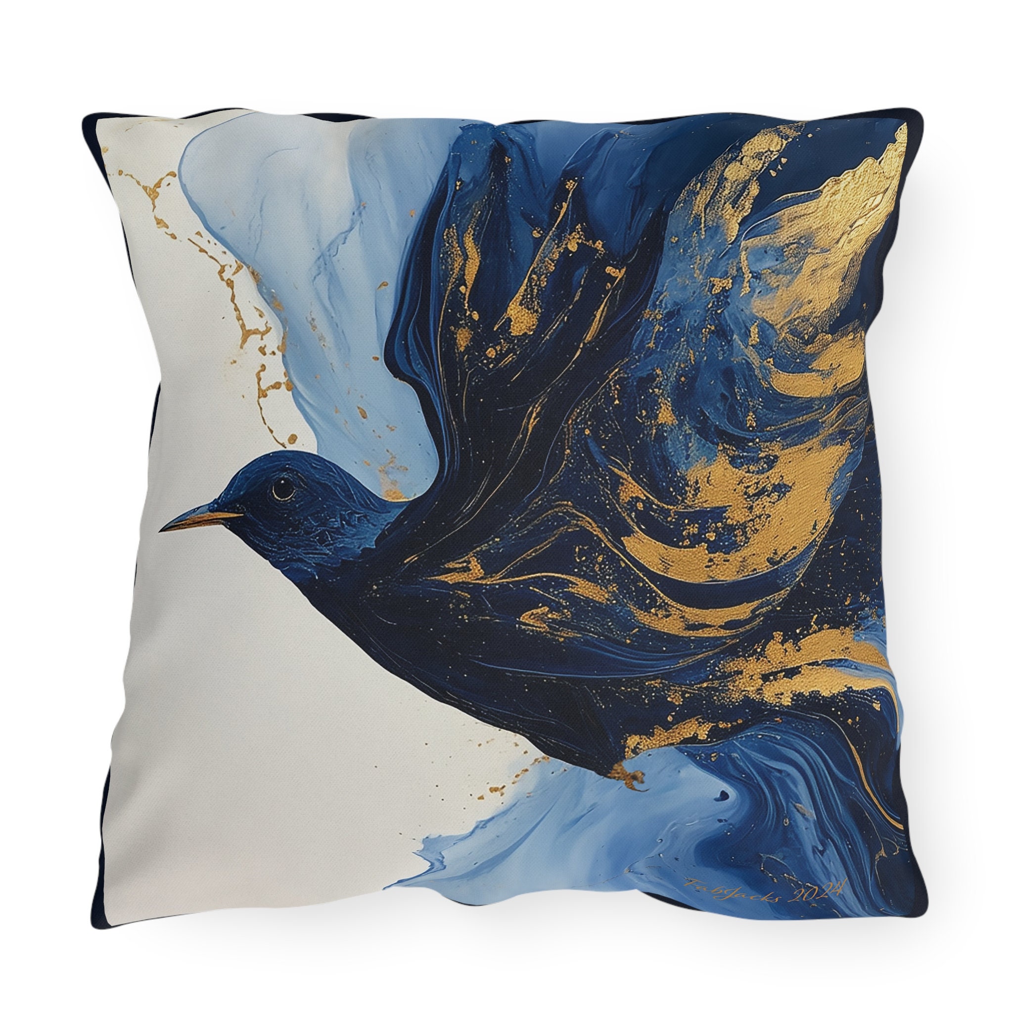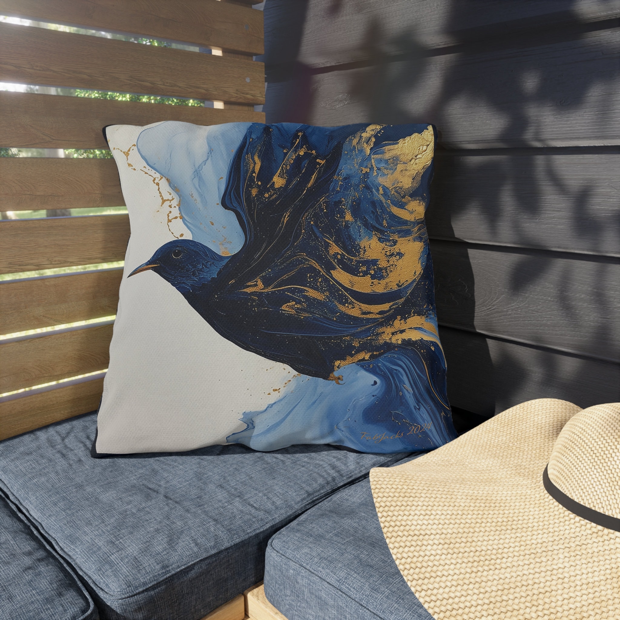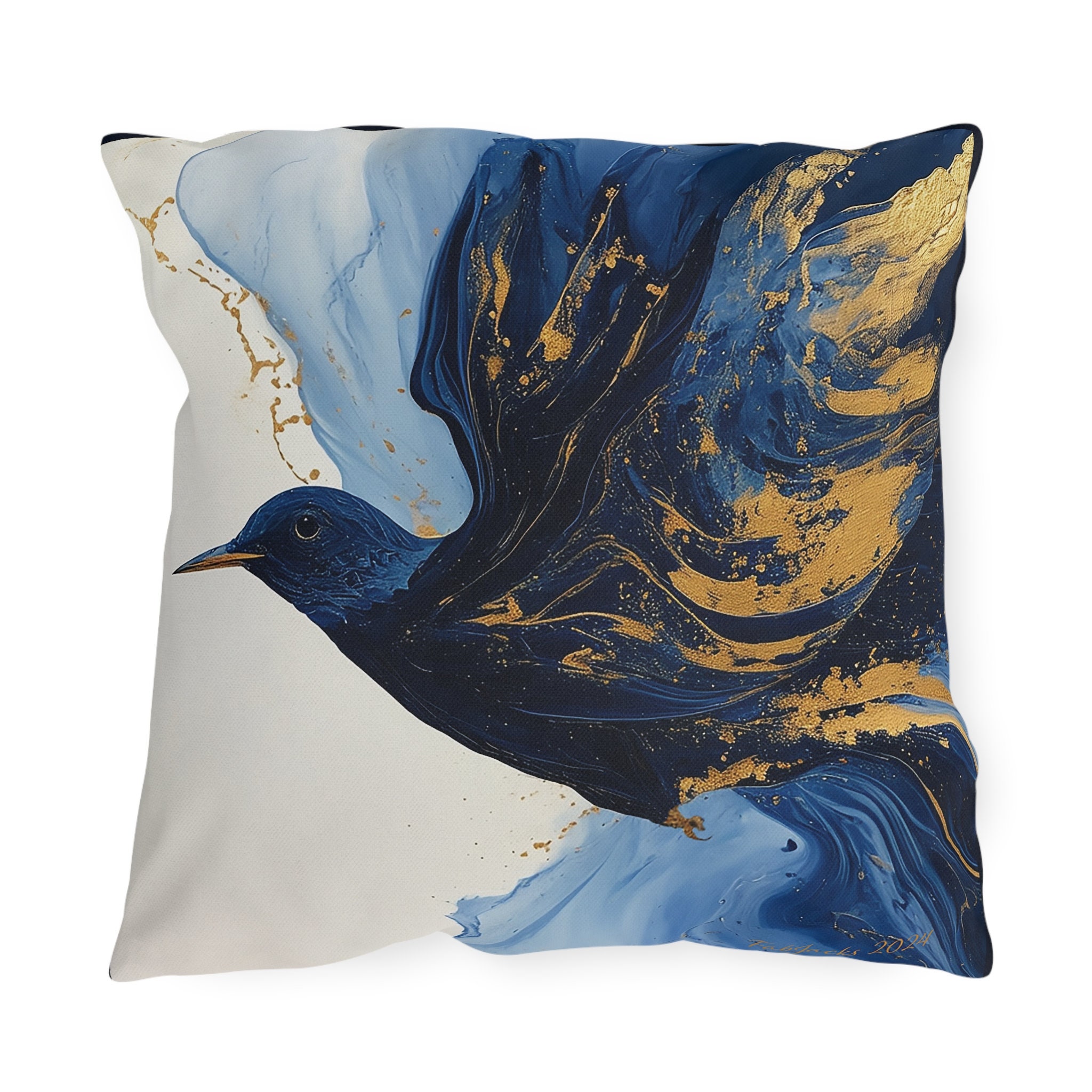 Skyward Outdoor Pillow - original art in shades of blue with golden accents printed on high quality home decor. Great gift for bird lovers.