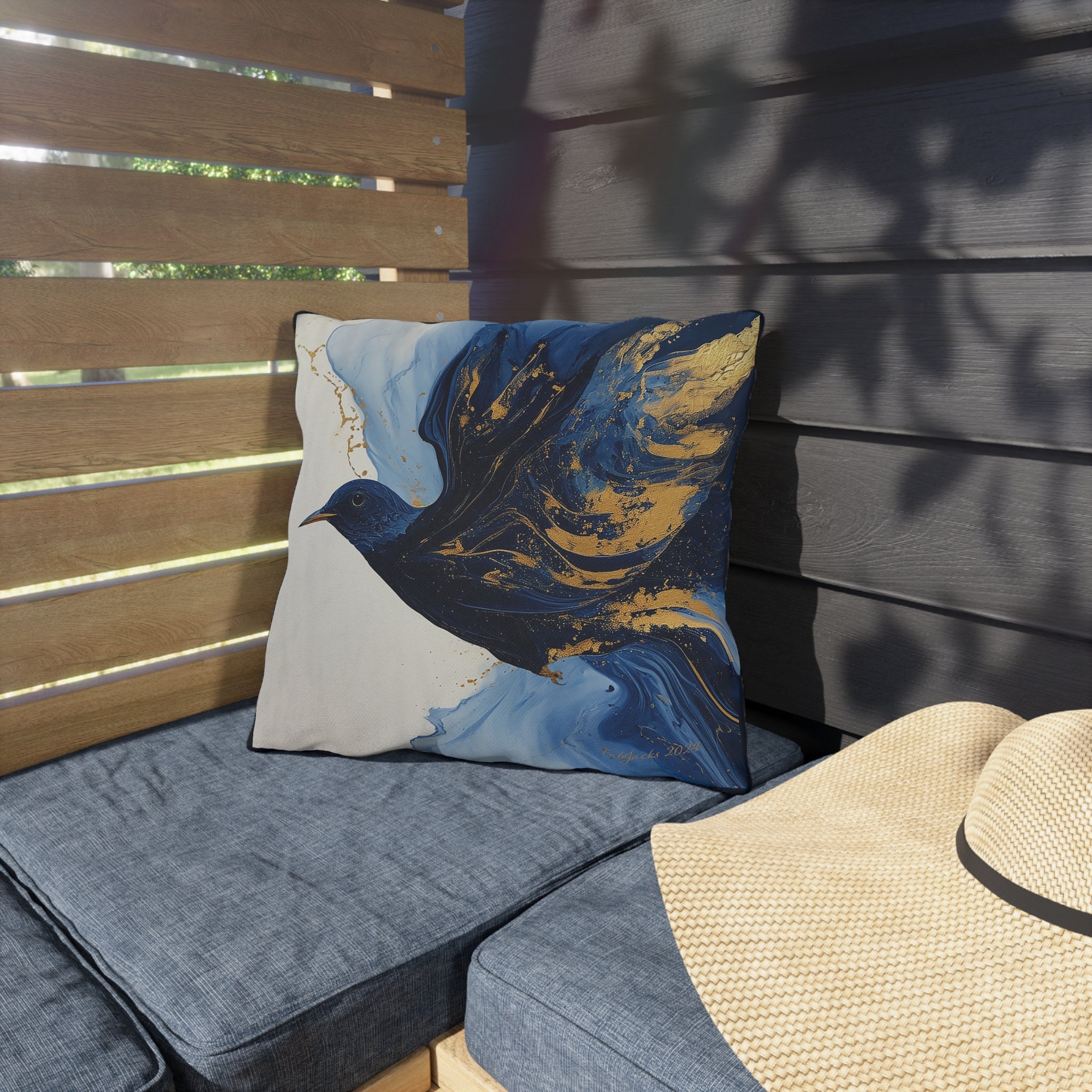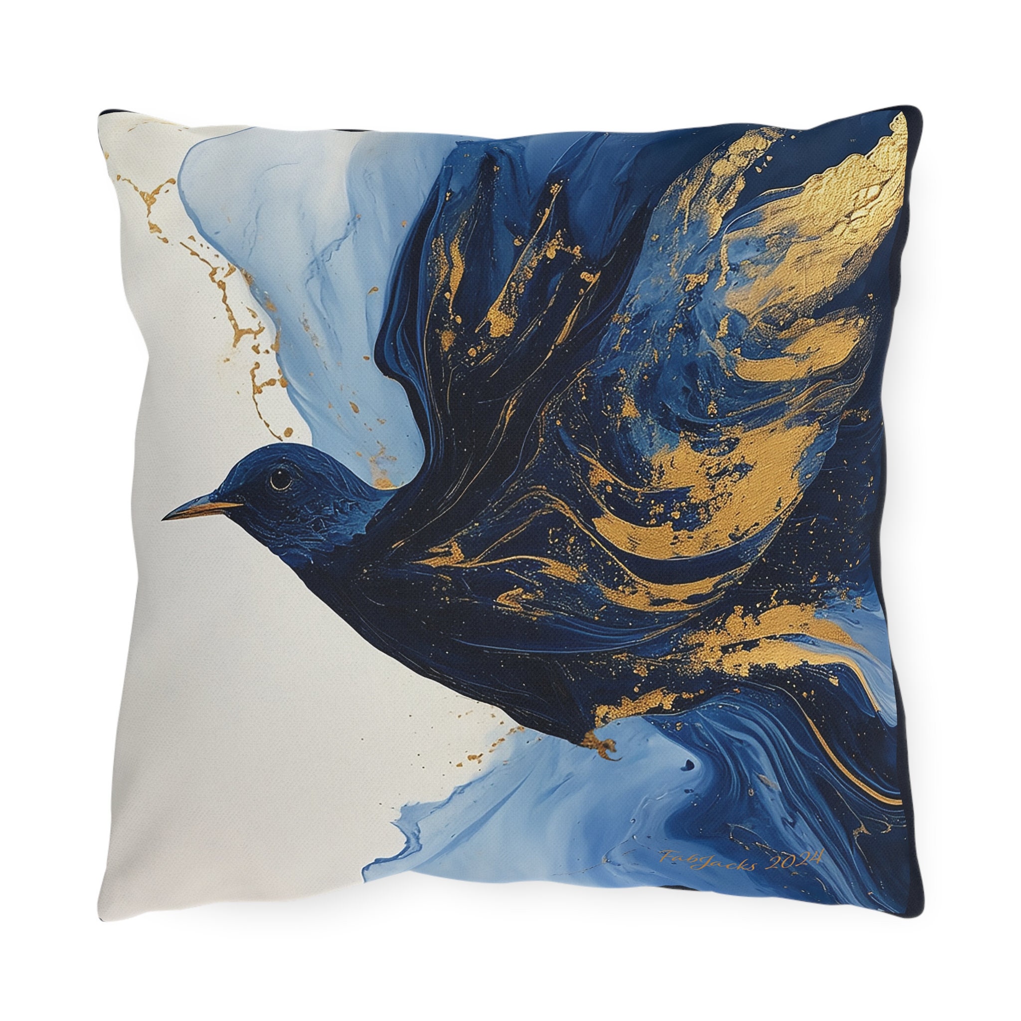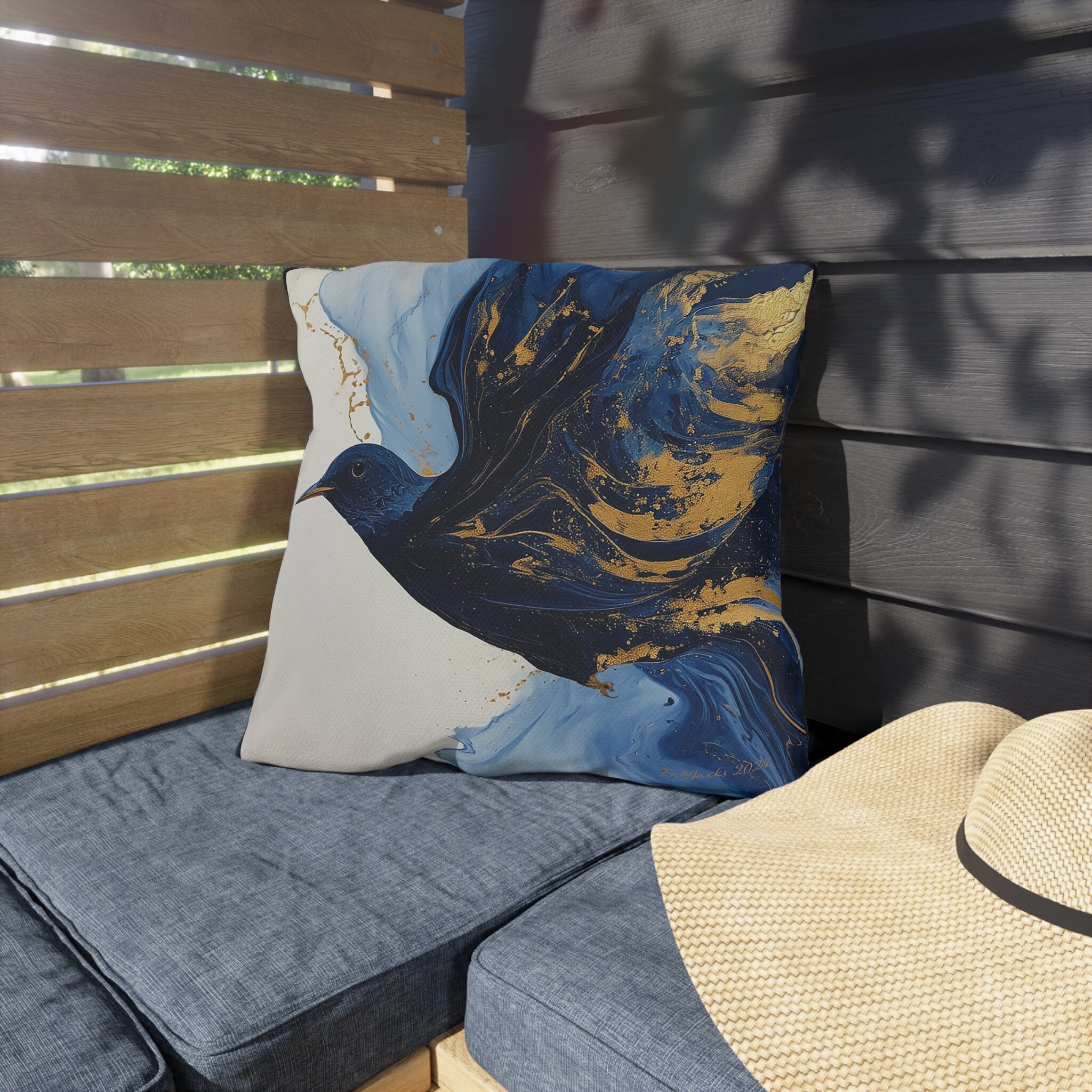Skyward Outdoor Pillow - original art in shades of blue with golden accents printed on high quality home decor. Great gift for bird lovers.