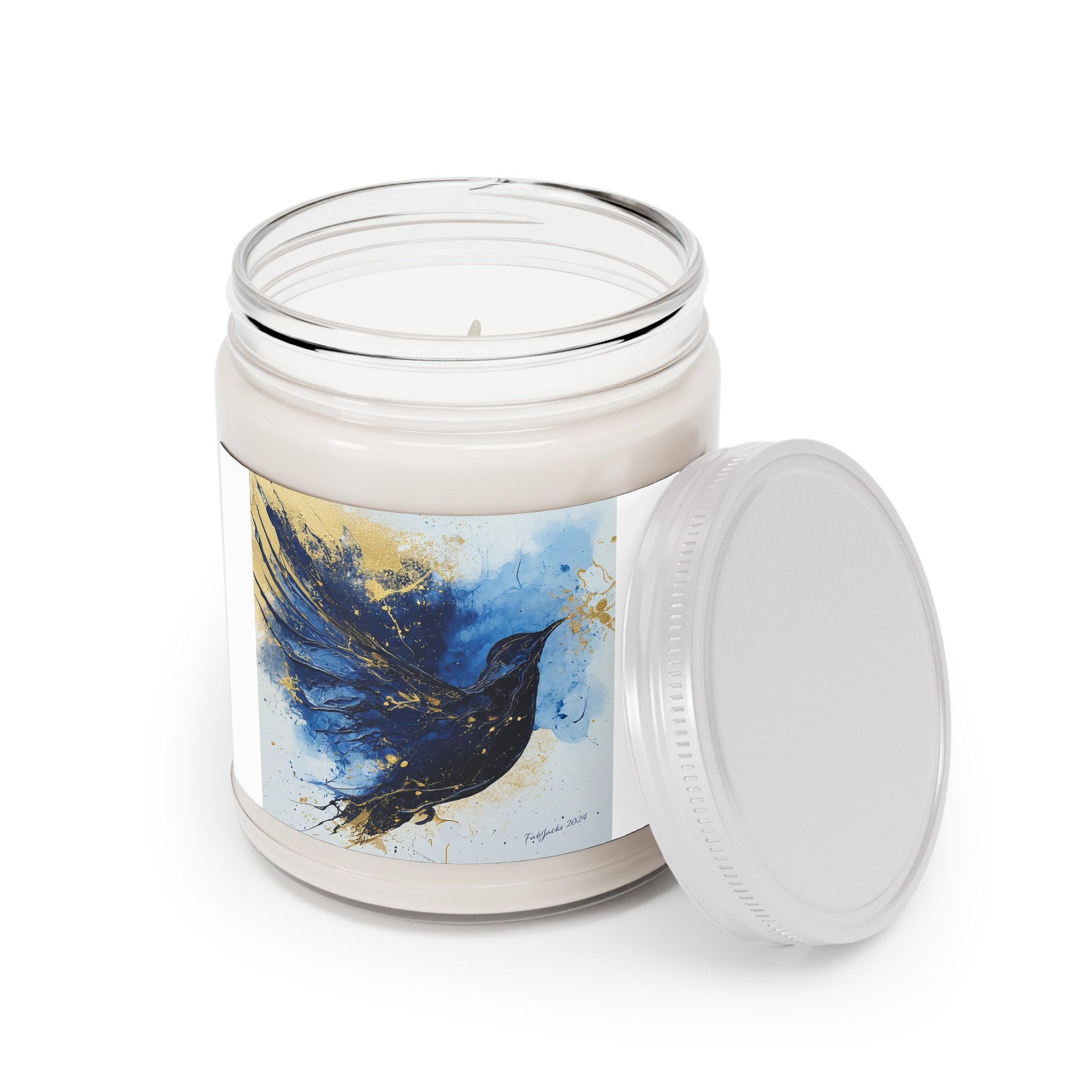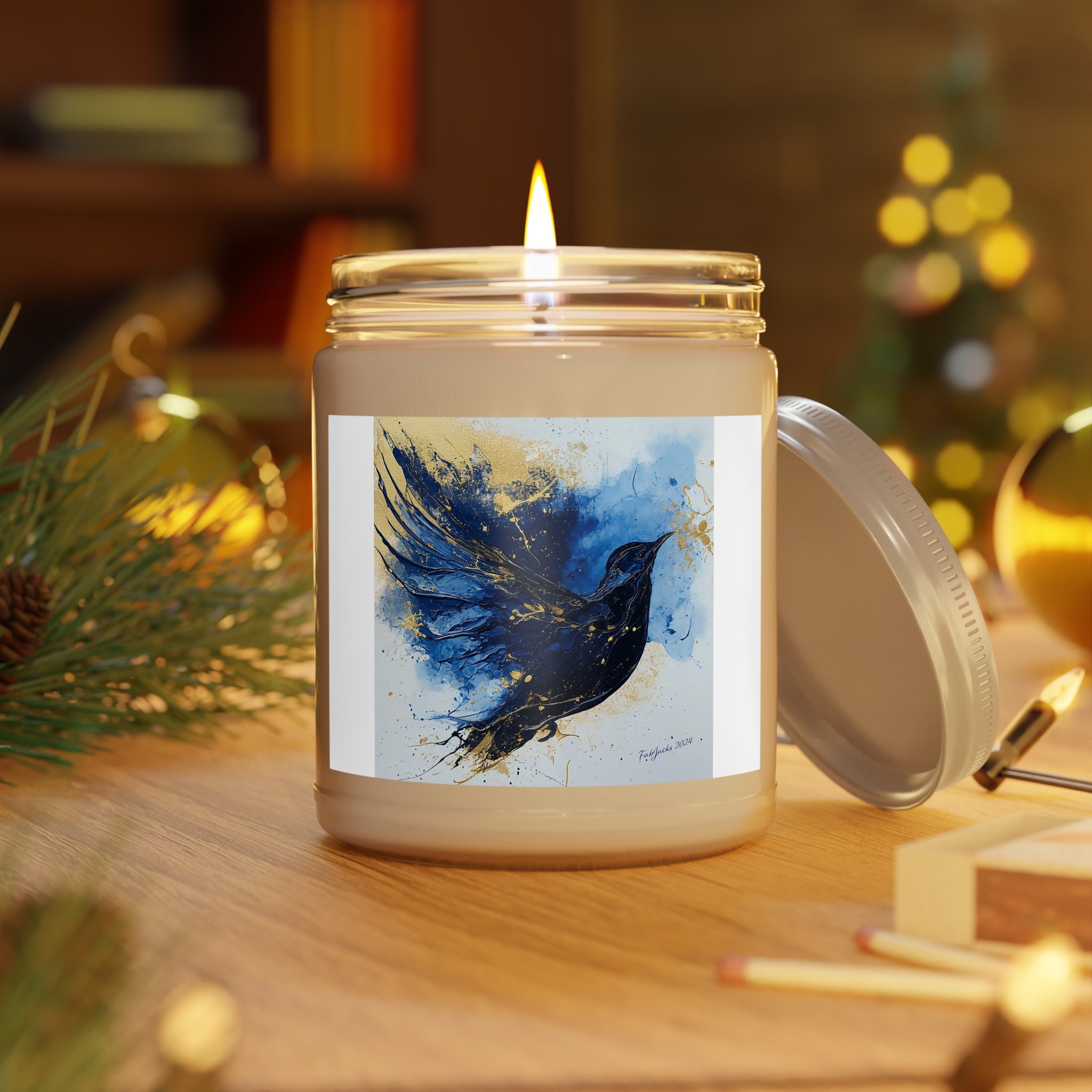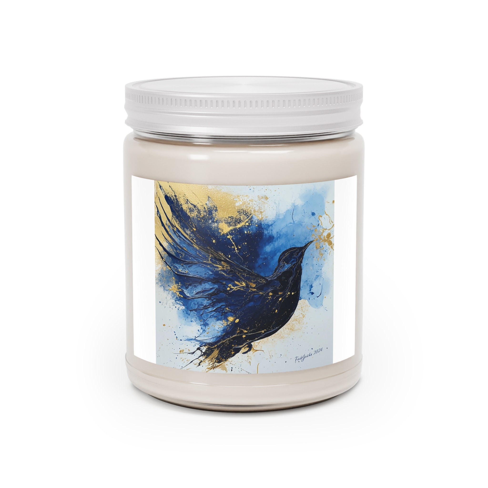 Symphony Scented Candles: original art in shades of blue with golden accents printed on high quality home decor. Great gift for bird lovers.