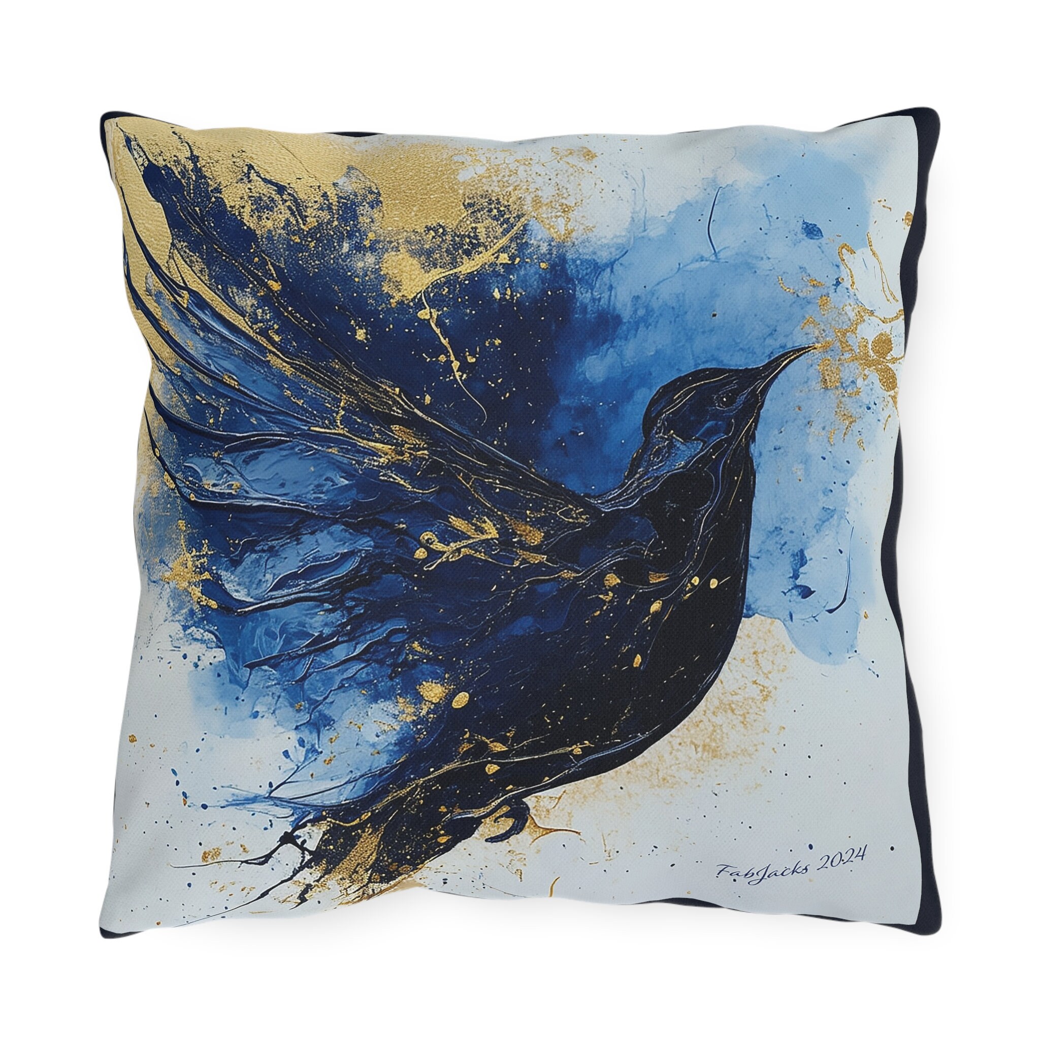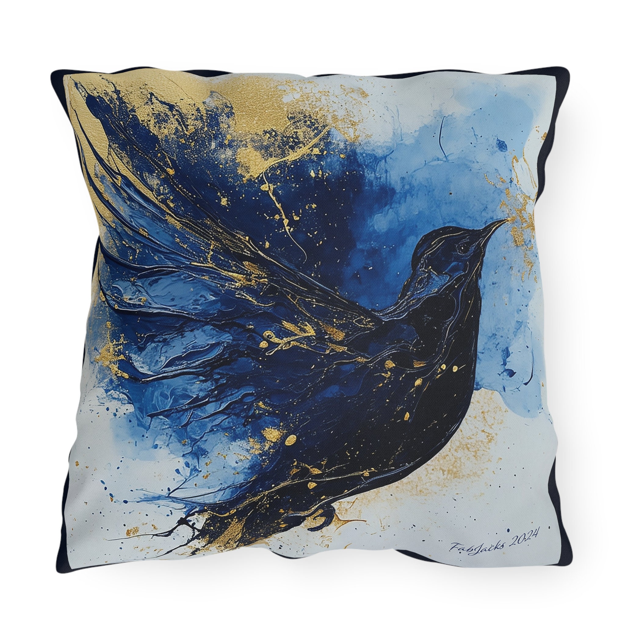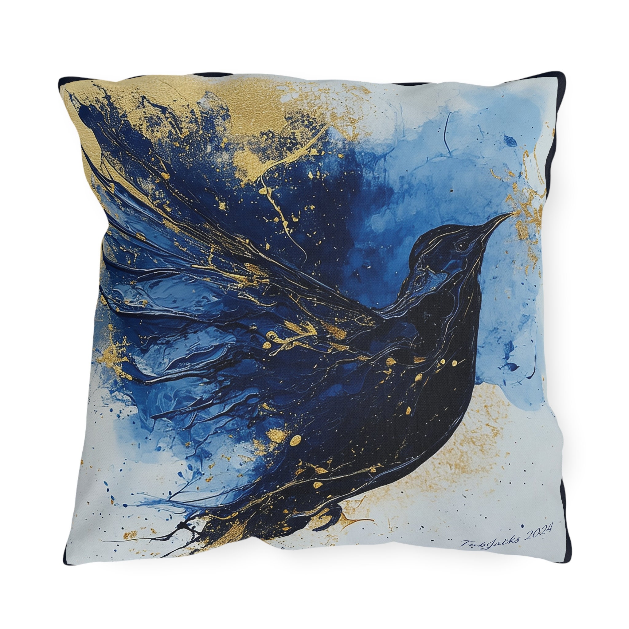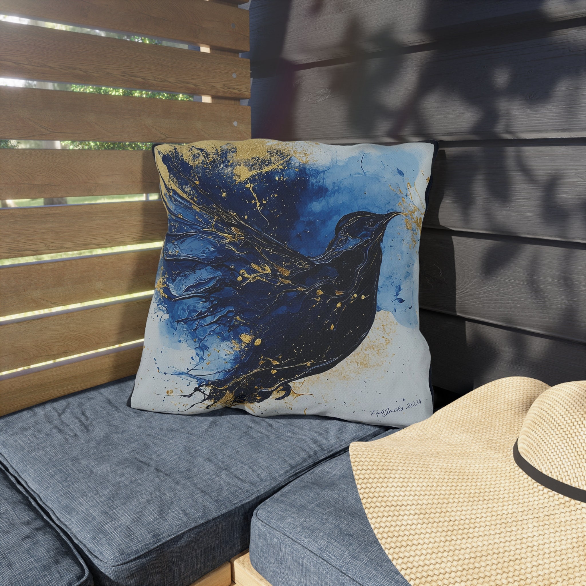 Symphony Outdoor Pillow - original art in shades of blue with golden accents printed on high quality home decor. Great gift for bird lovers.