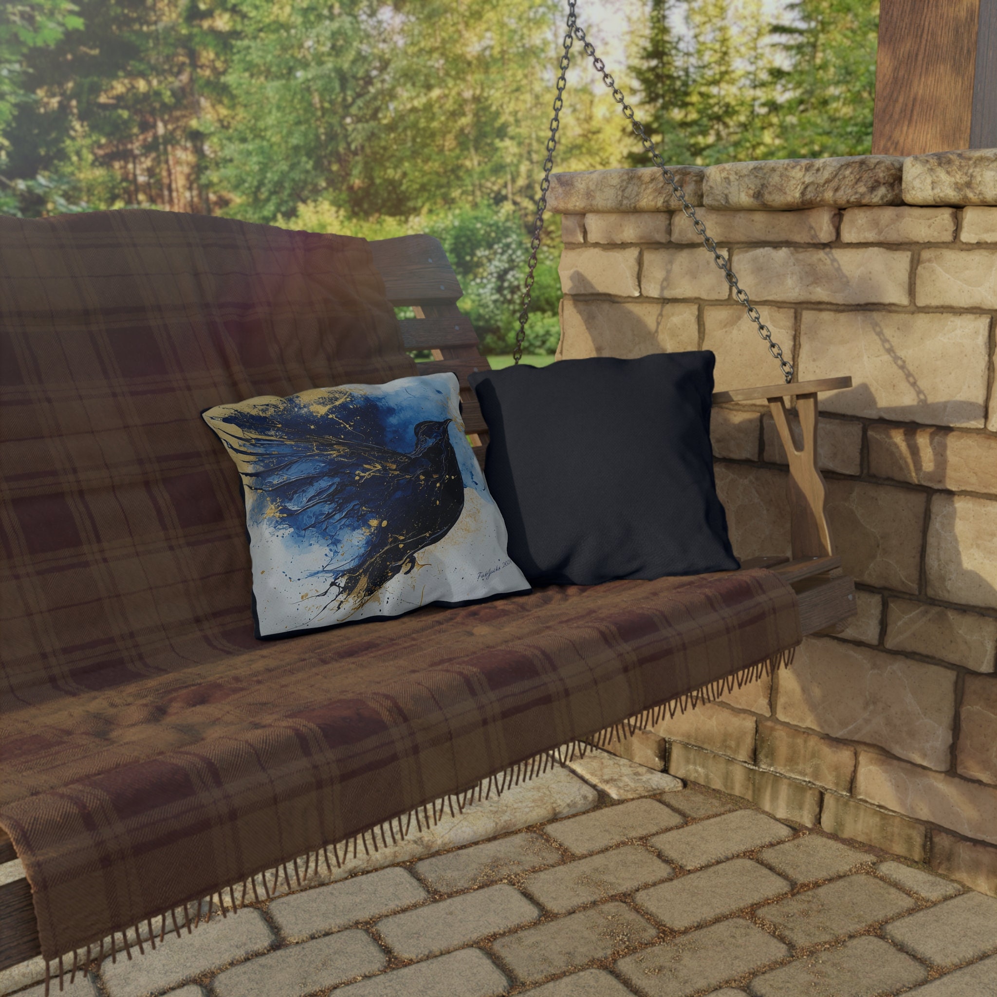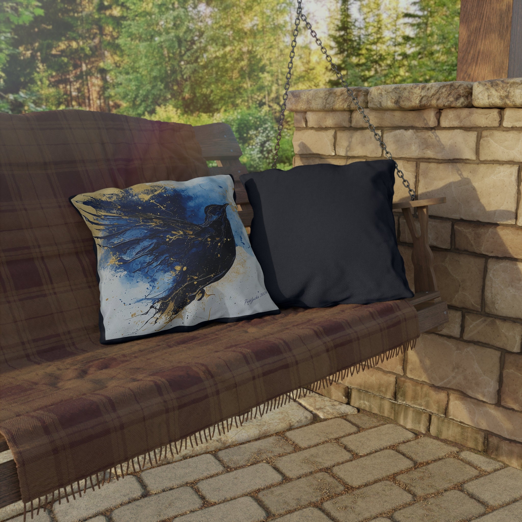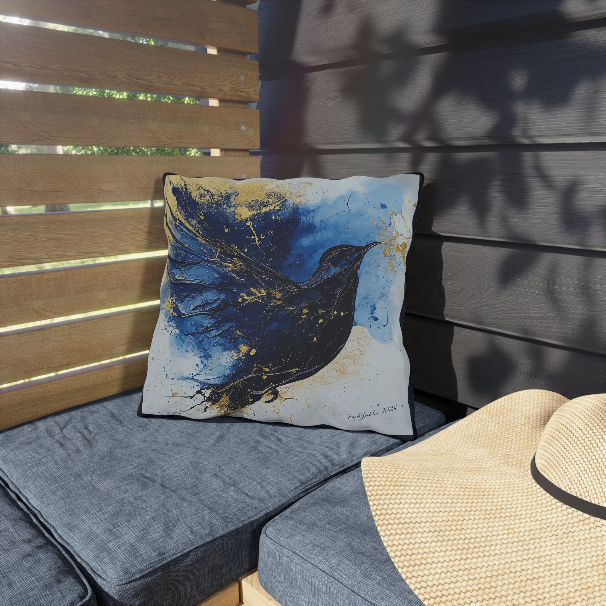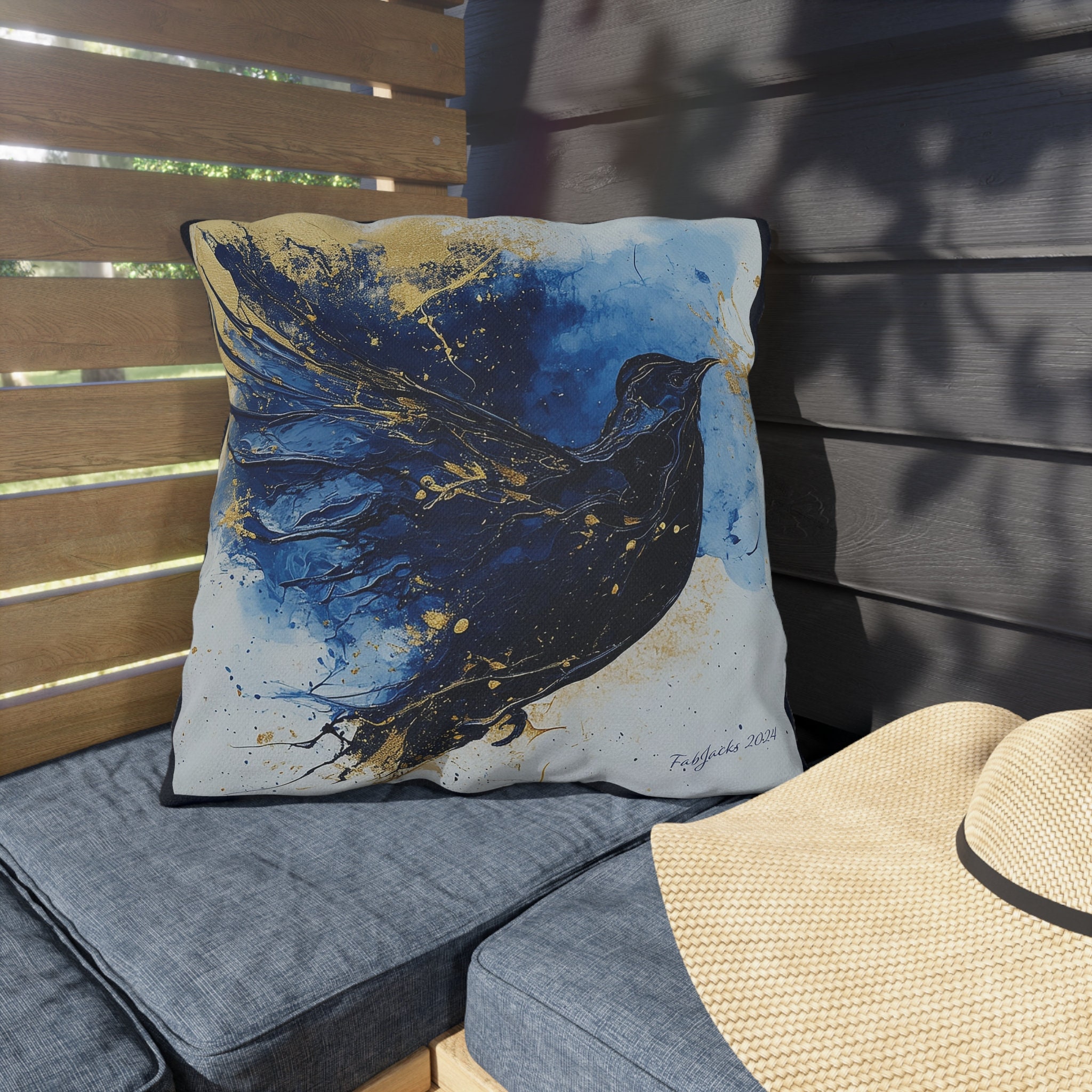 Symphony Outdoor Pillow - original art in shades of blue with golden accents printed on high quality home decor. Great gift for bird lovers.