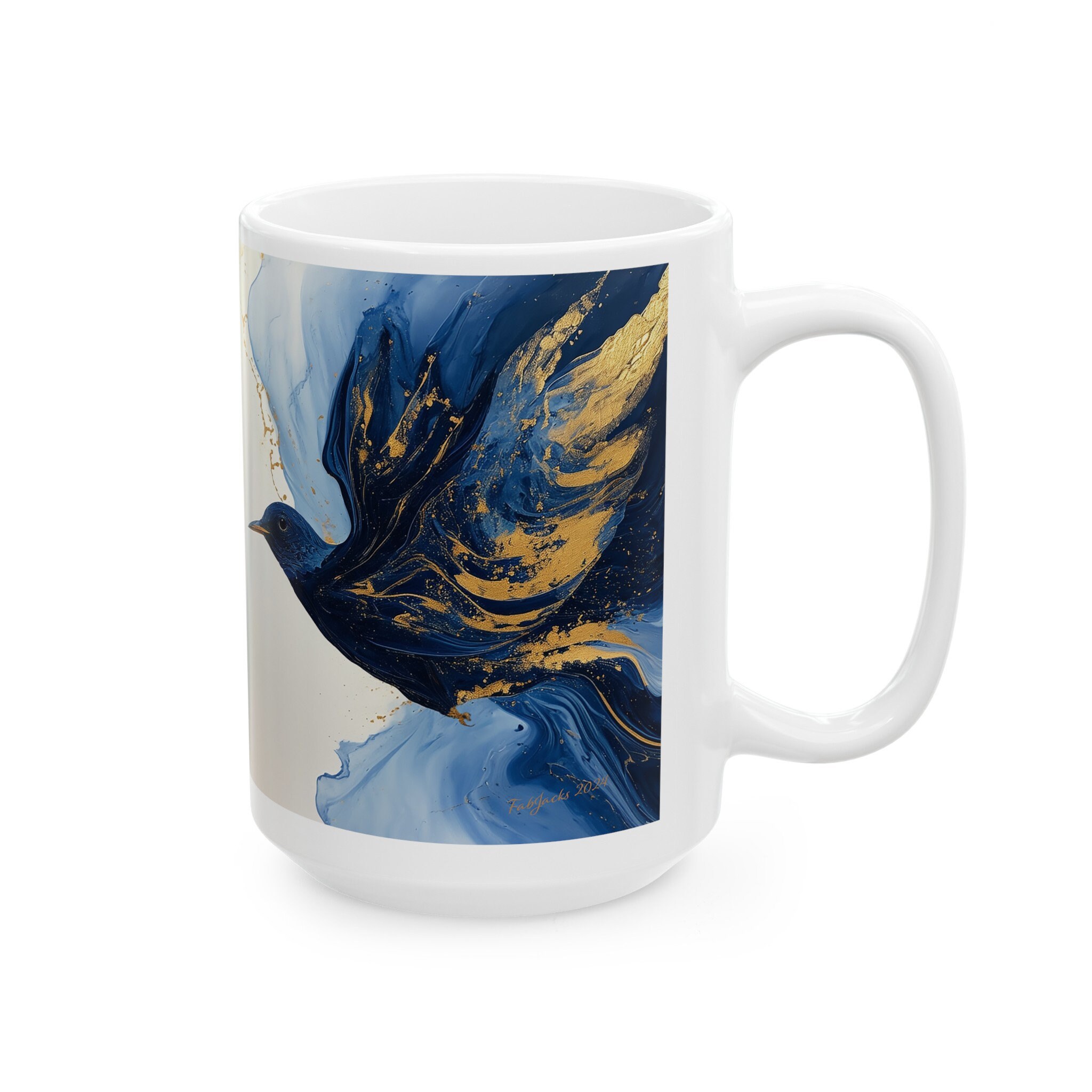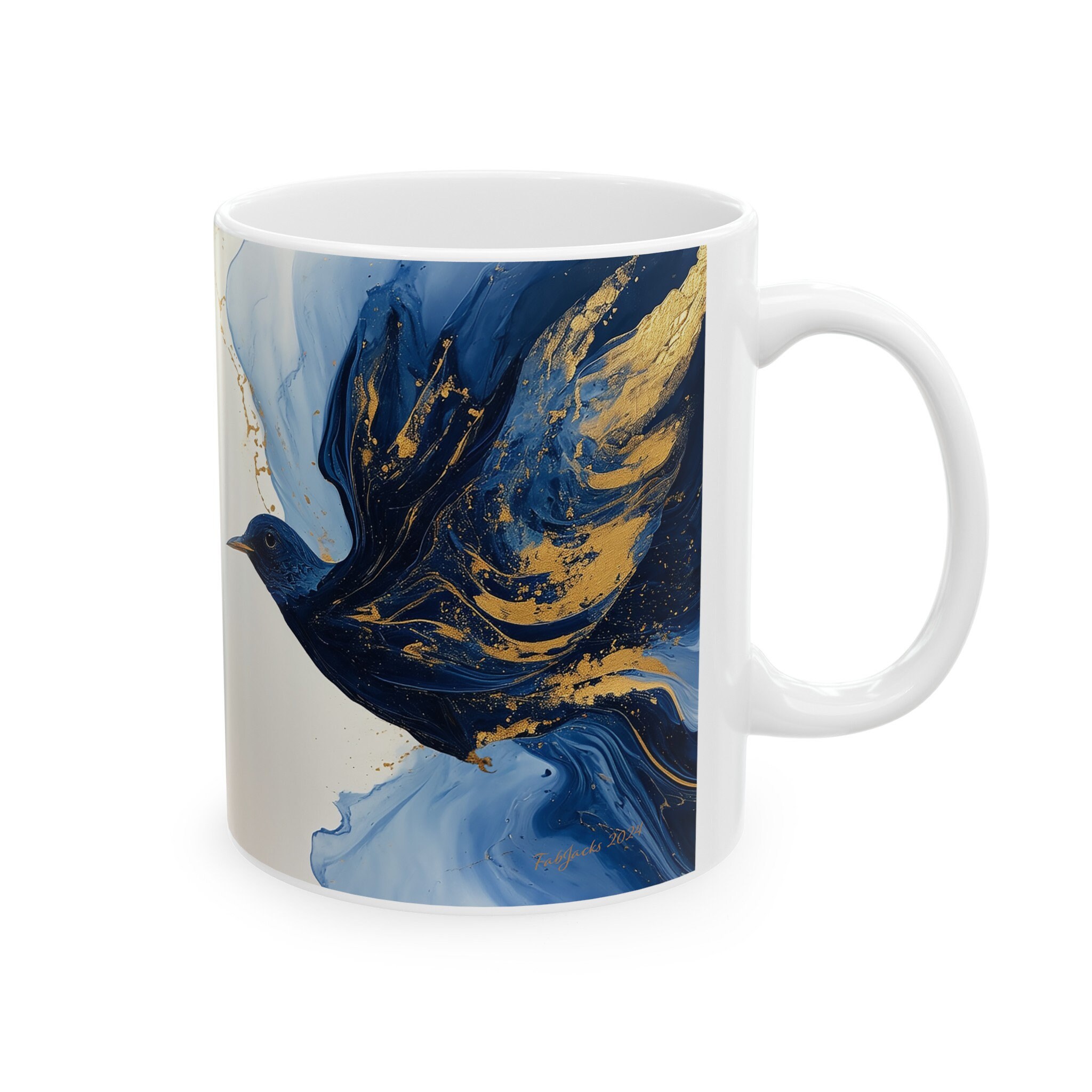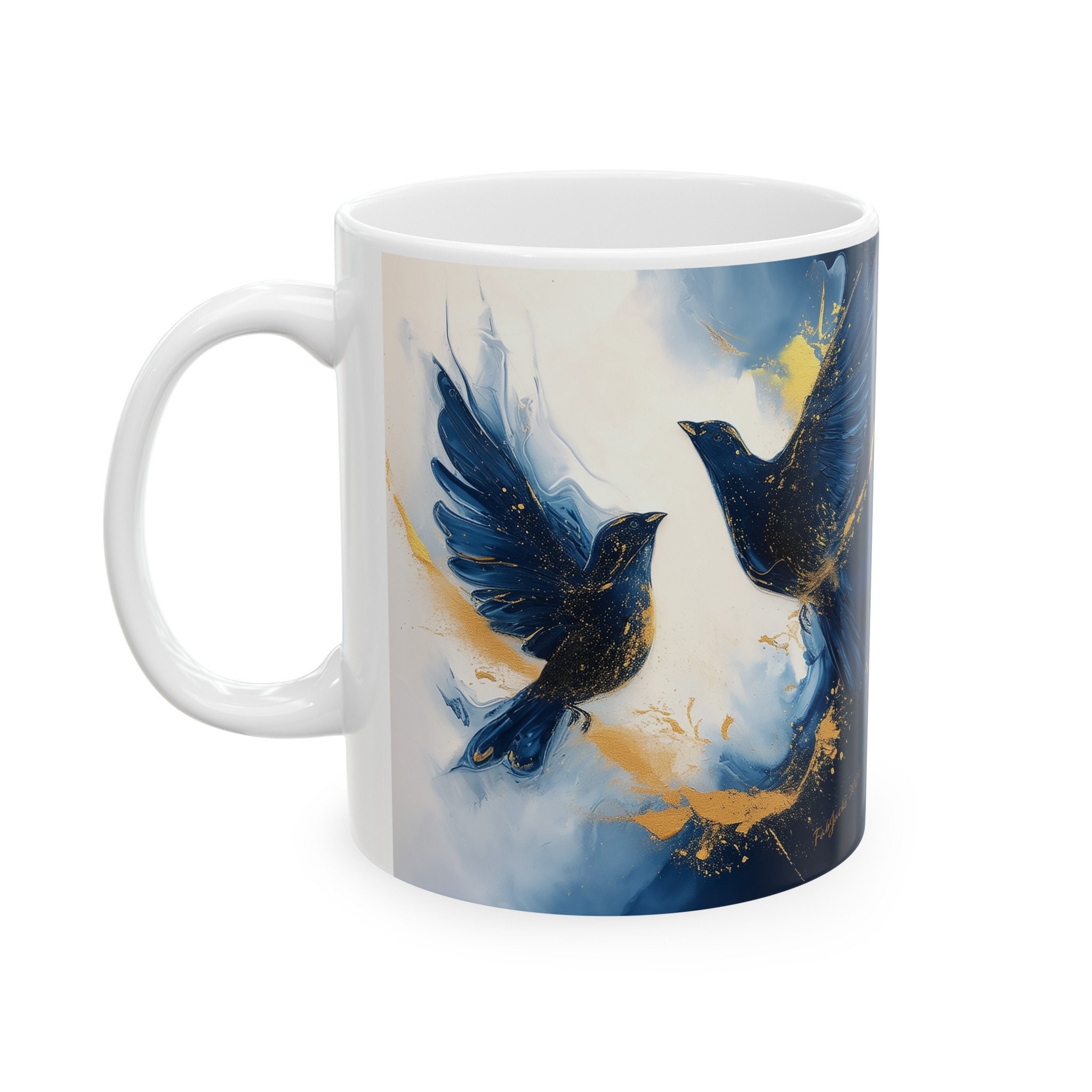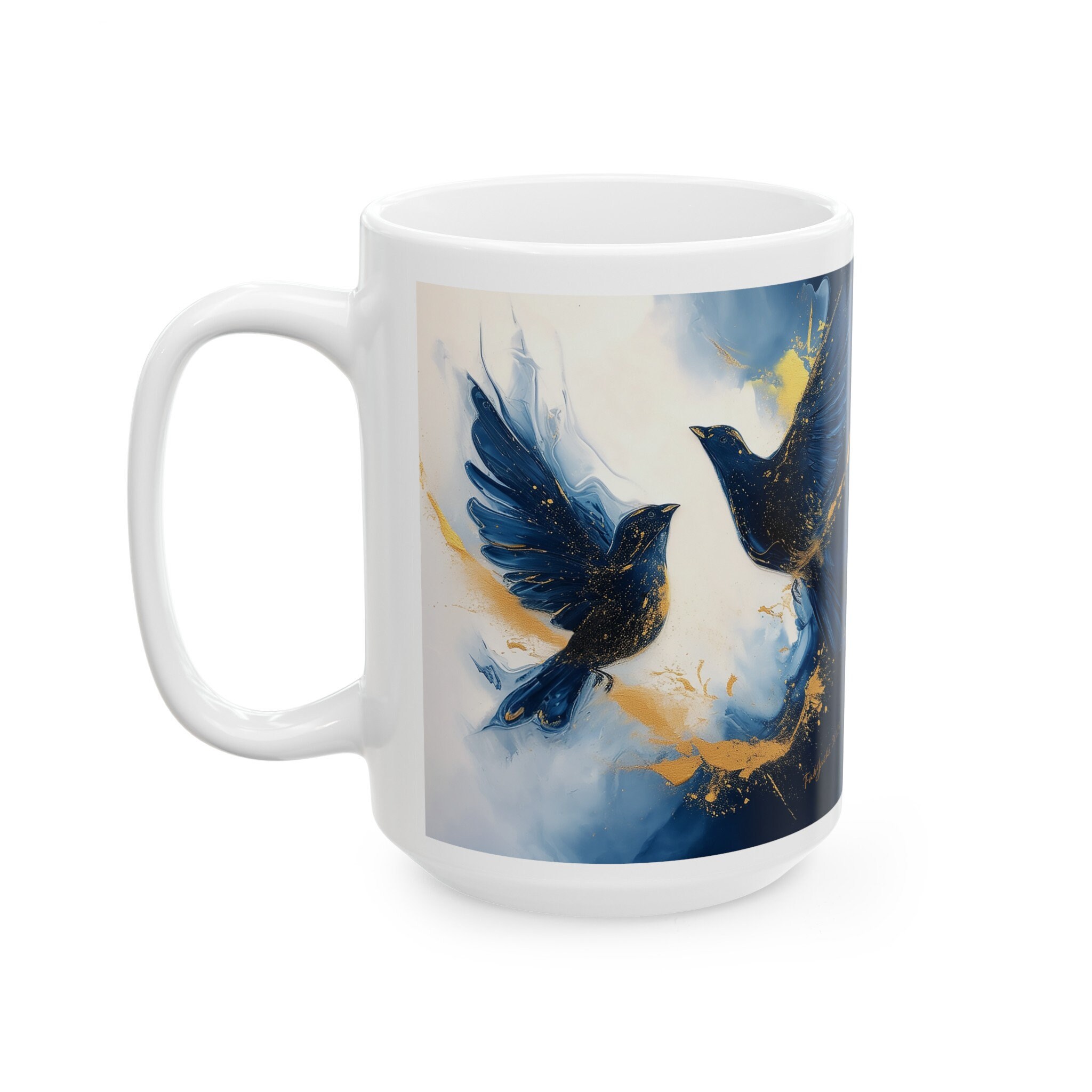 Skyward Symphony Ceramic Mug- original art in blue with golden accents printed on high quality home decor. Great gift for bird lovers.