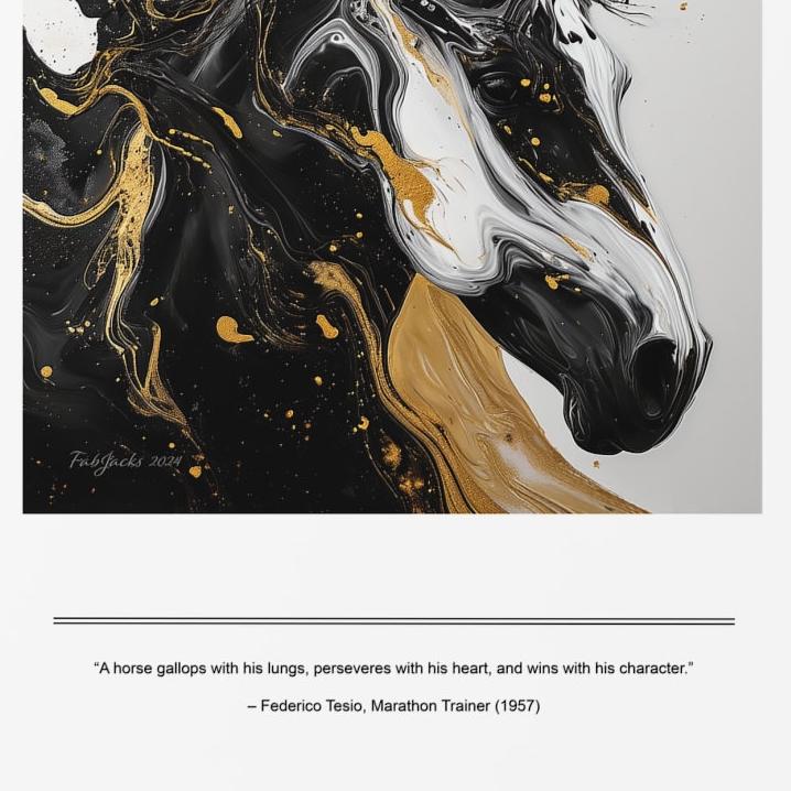 The Stallion Serenade created in the fluid art style in black, white, and gold seeks to portray strength and poetry of the beautiful creature that is a horse.
