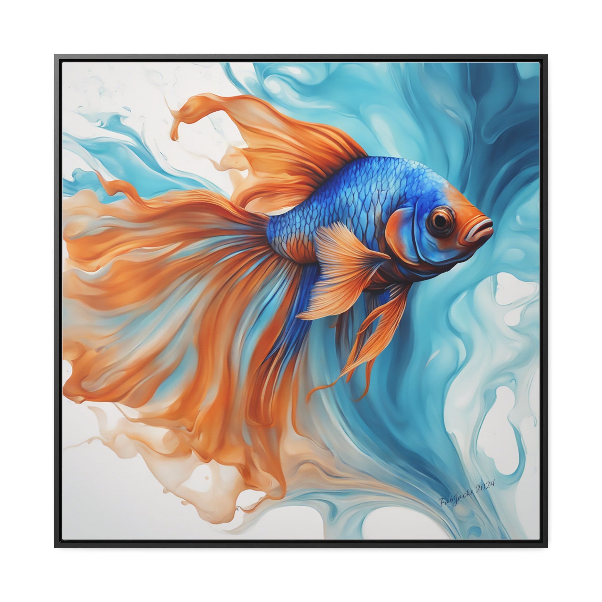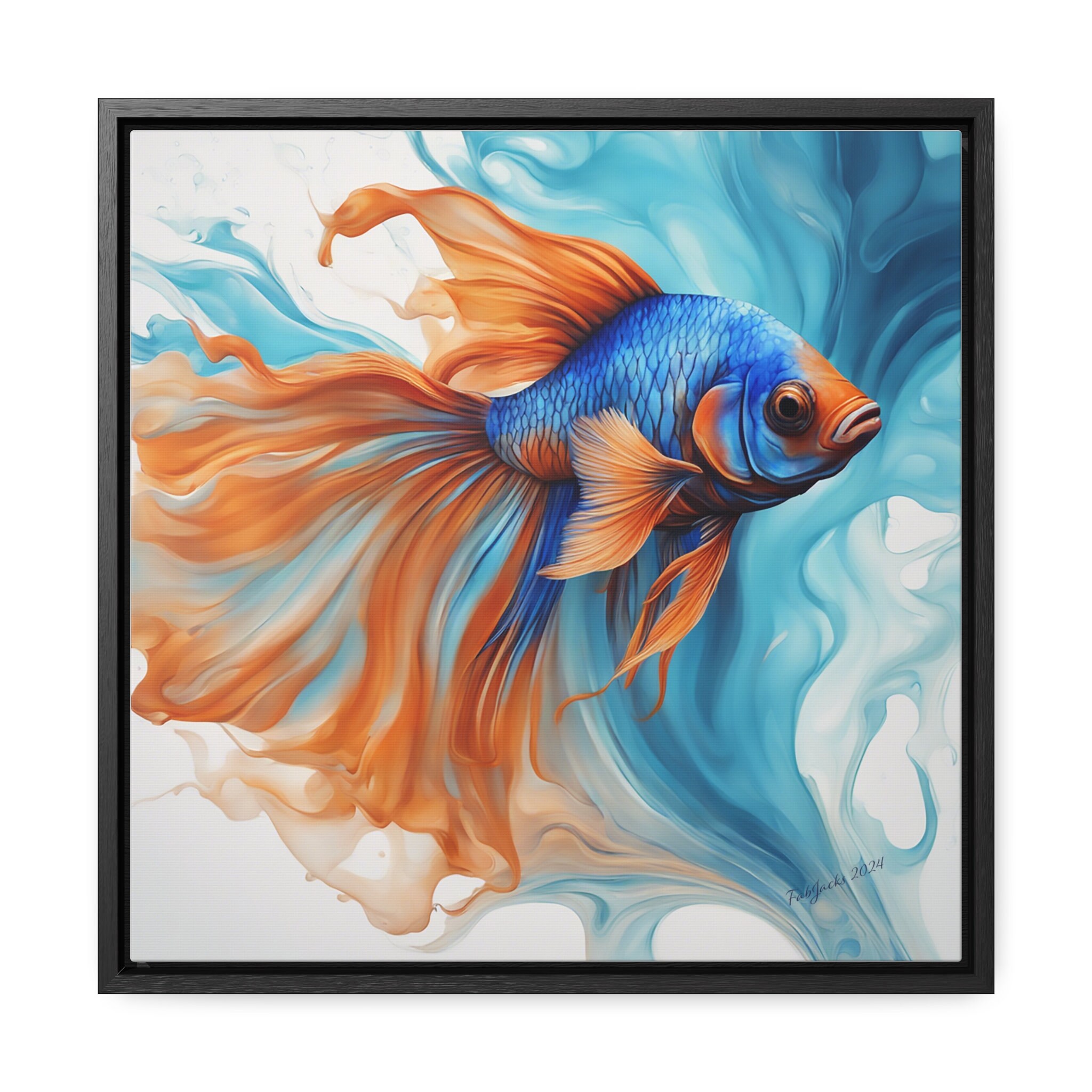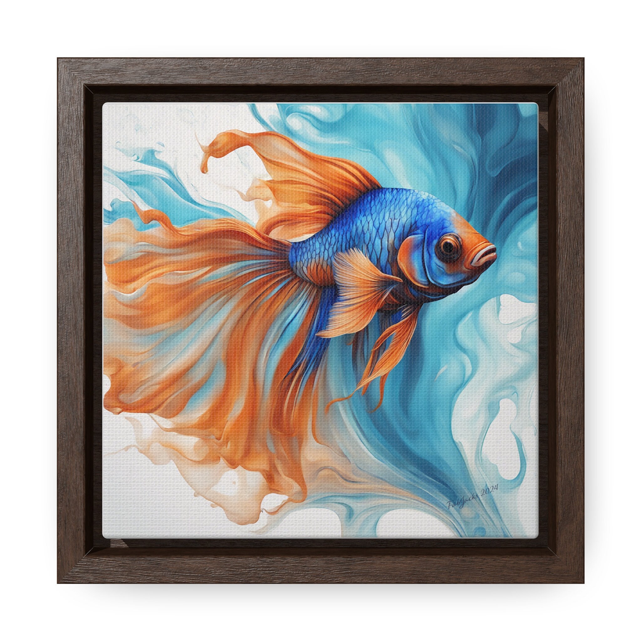 Dive into a world of vibrant hues and fluid elegance inspired by the mesmerizing beauty of blue and orange Betta fish. Let your personality be reflected on the artwork adorning your walls. This square gallery wrapped canvas print will always look as tight and flat as the day it was made. Every frame is built with a solid face to support the canvas and prevent deforming. Available in multiple sizes, comes in walnut and black frame options.