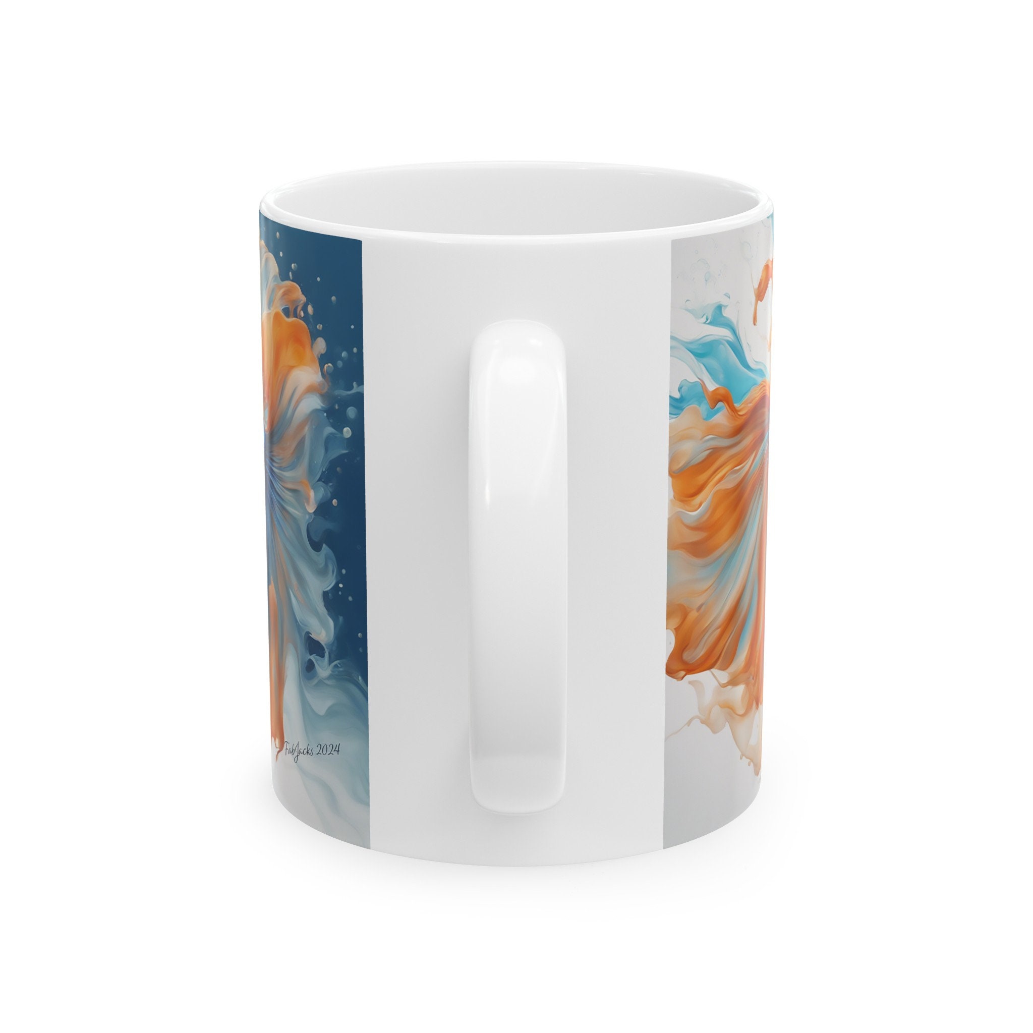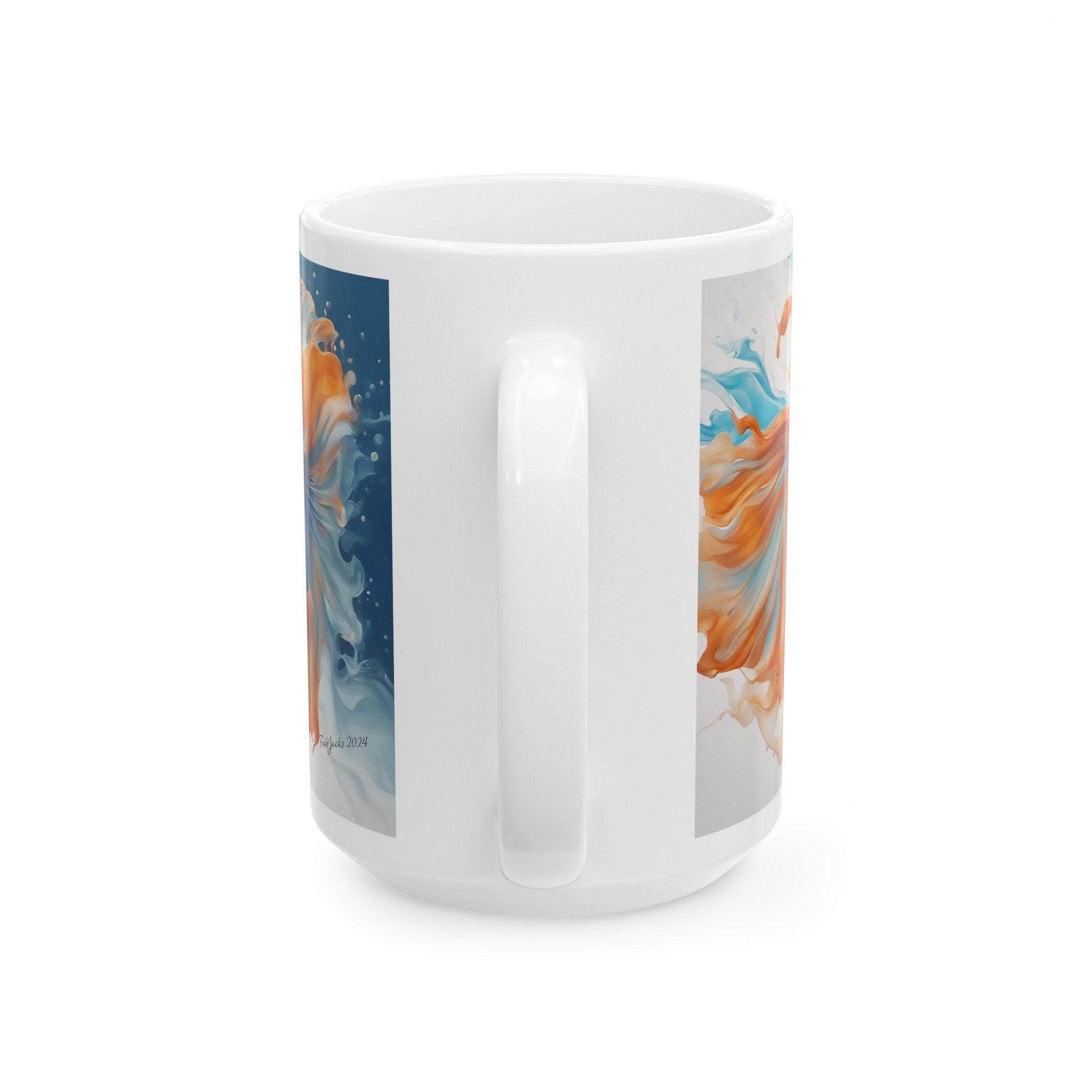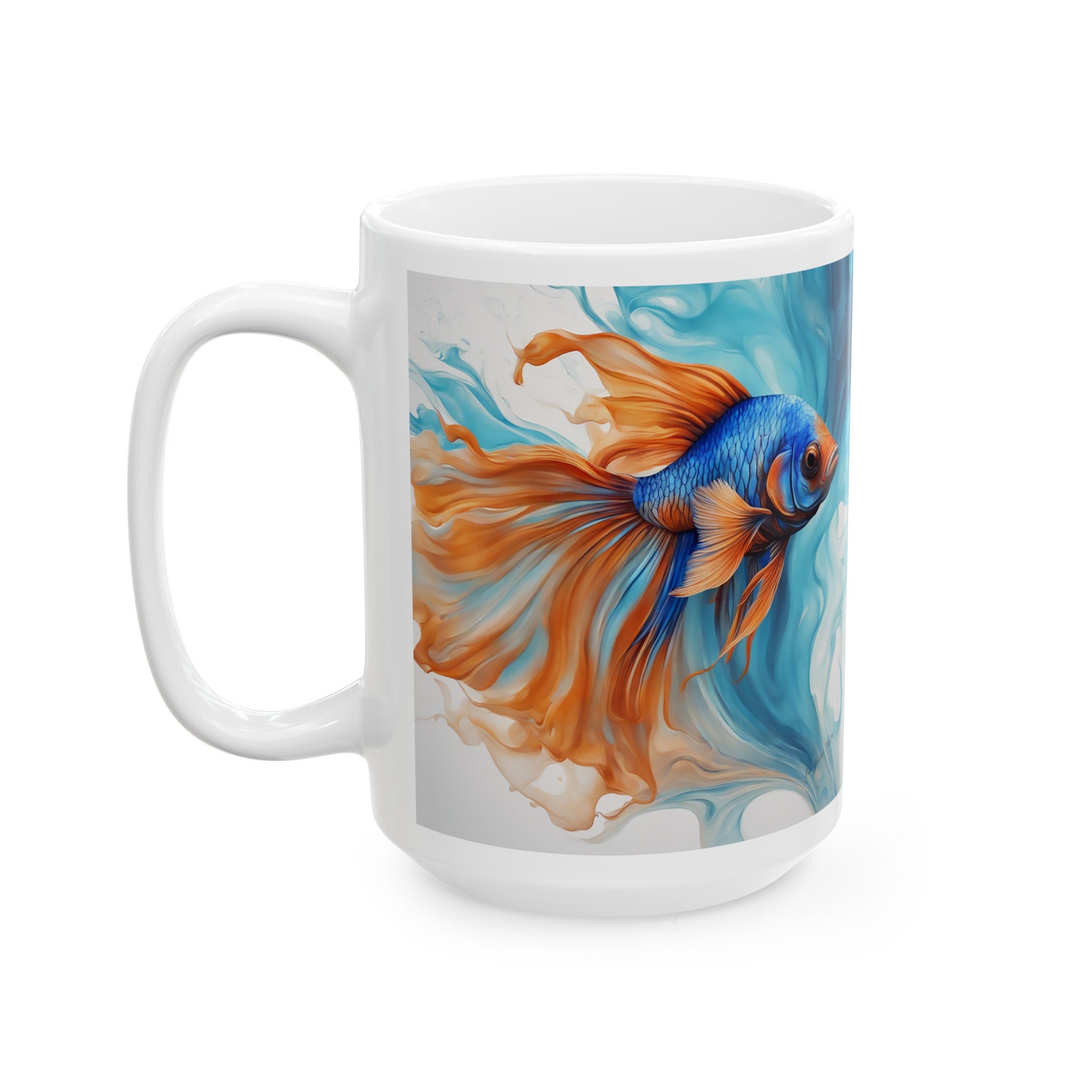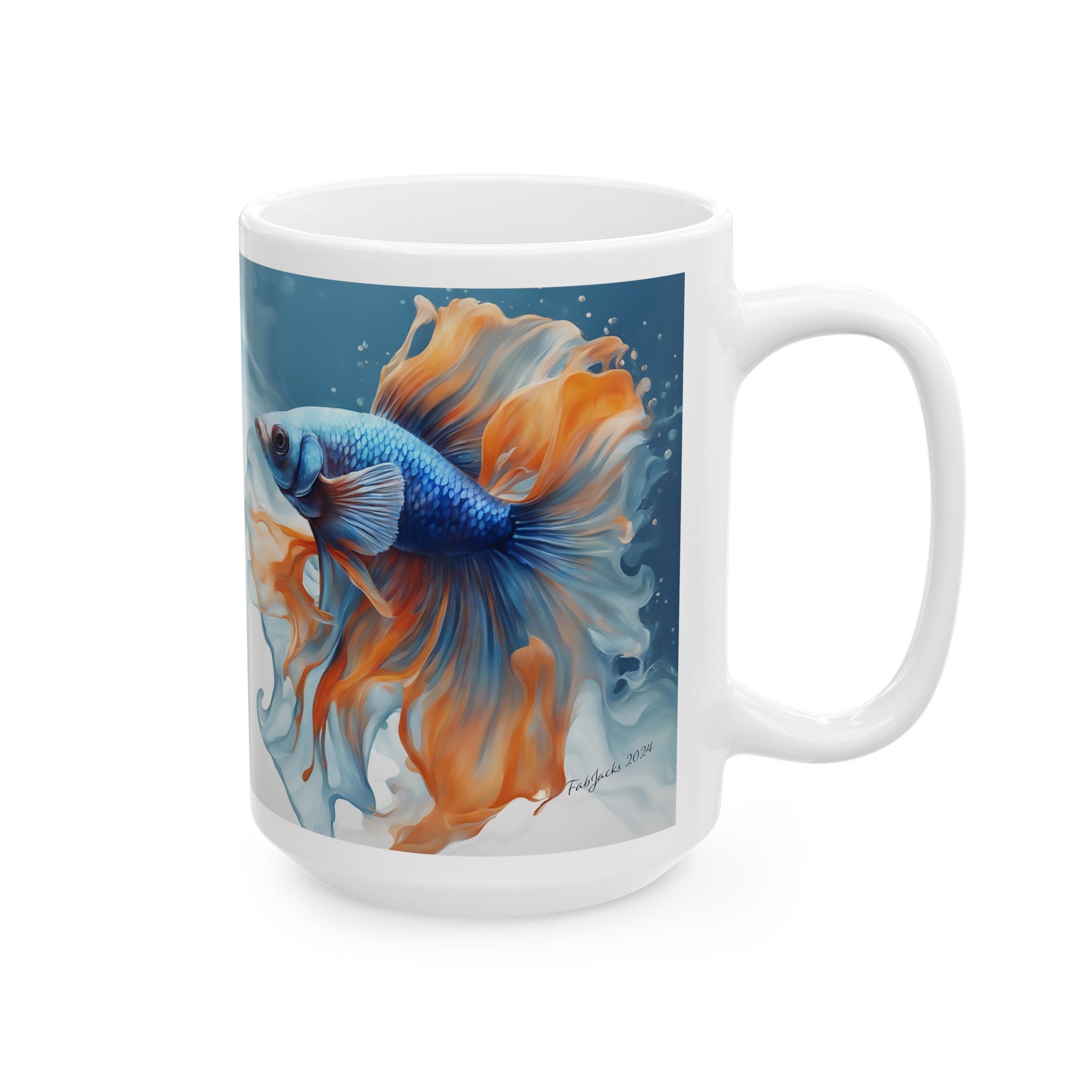 Dive into a world of vibrant hues and fluid elegance inspired by the mesmerizing beauty of blue and orange Beta fish. Warm-up with a nice cuppa out of this customized ceramic coffee mug. It’s BPA and Lead-free, microwave & dishwasher-safe, and made of white, durable ceramic in 11-ounce and 15-ounce sizes. Thanks to the advanced printing tech, our art comes to life with incredibly vivid colors – the perfect gift for coffee, tea, and chocolate lovers.