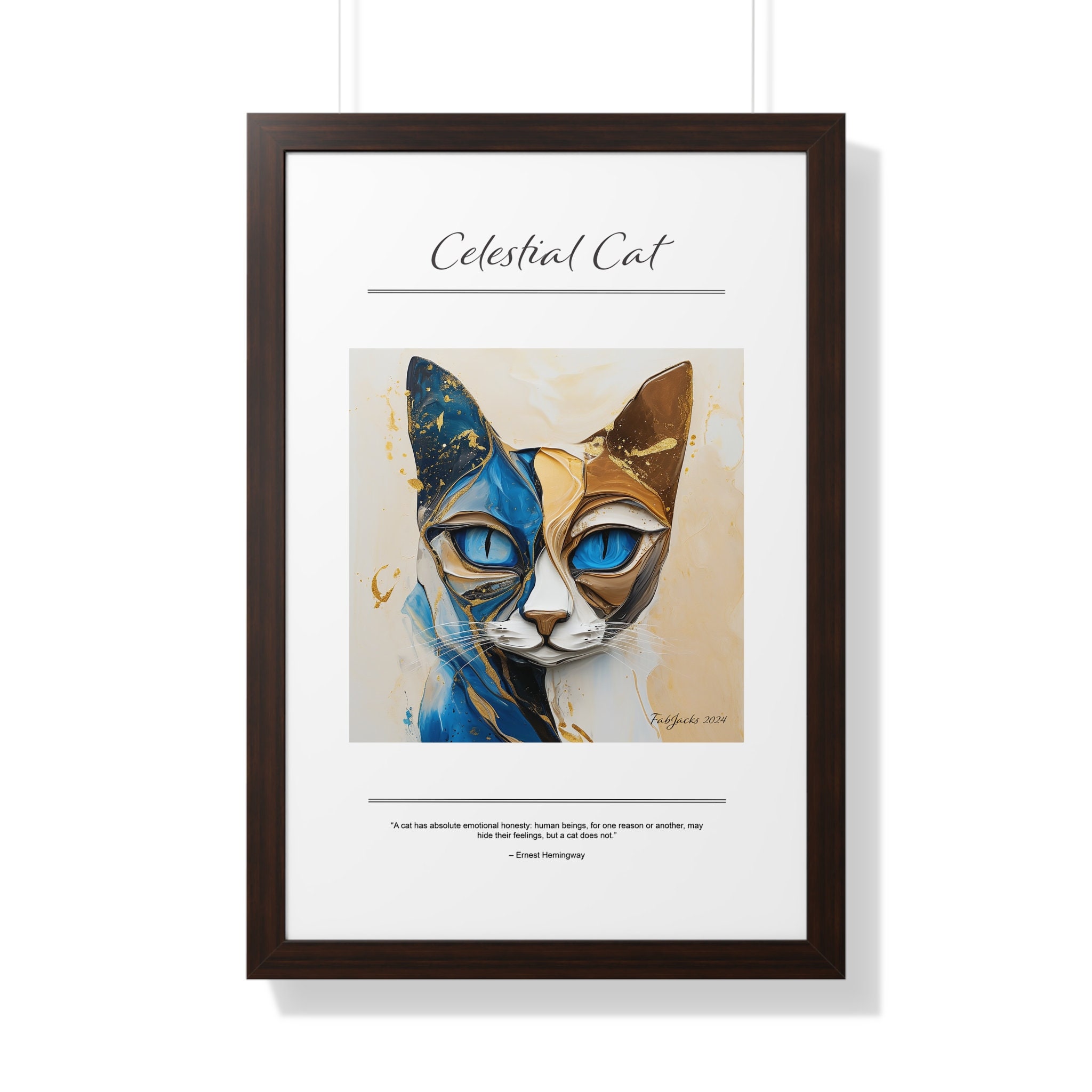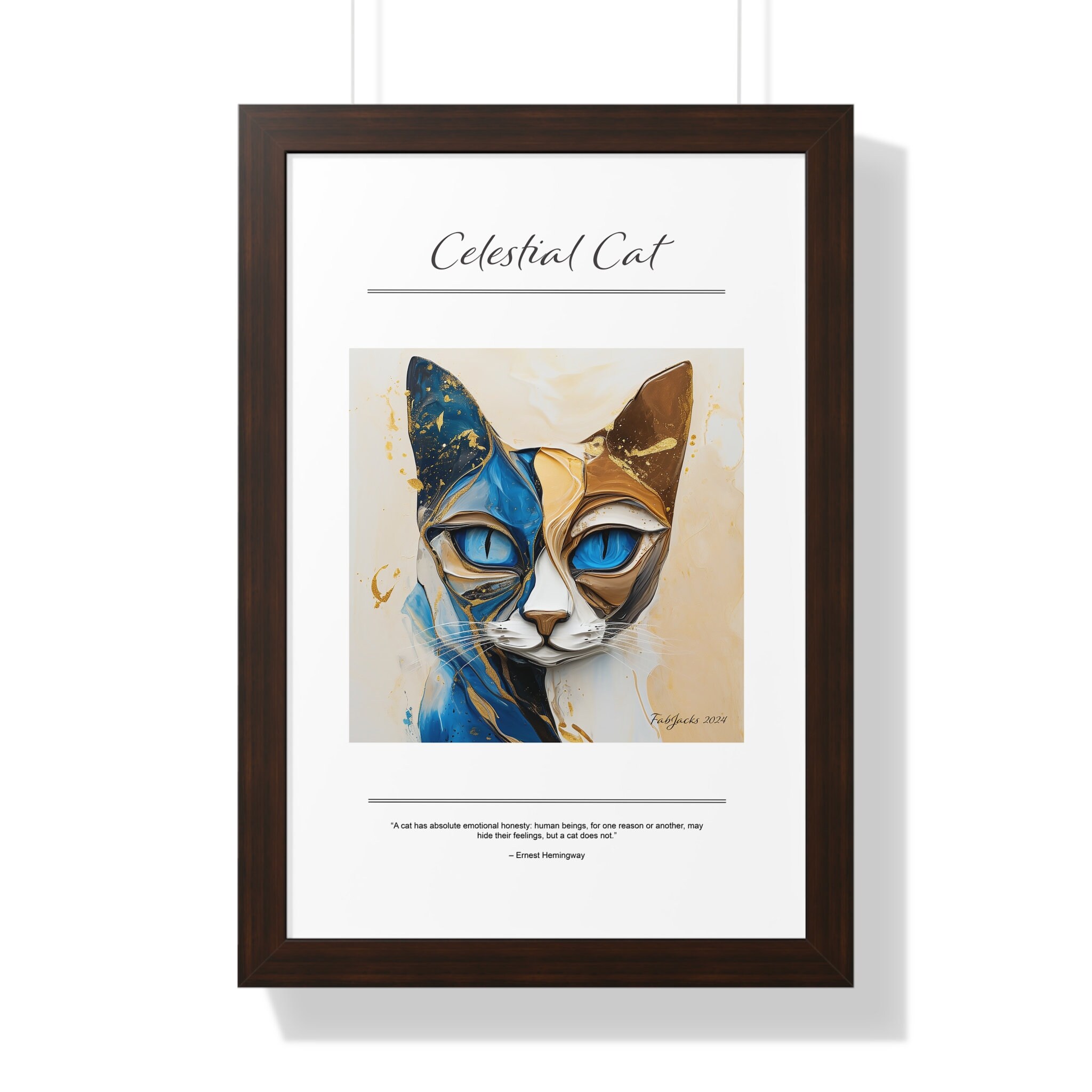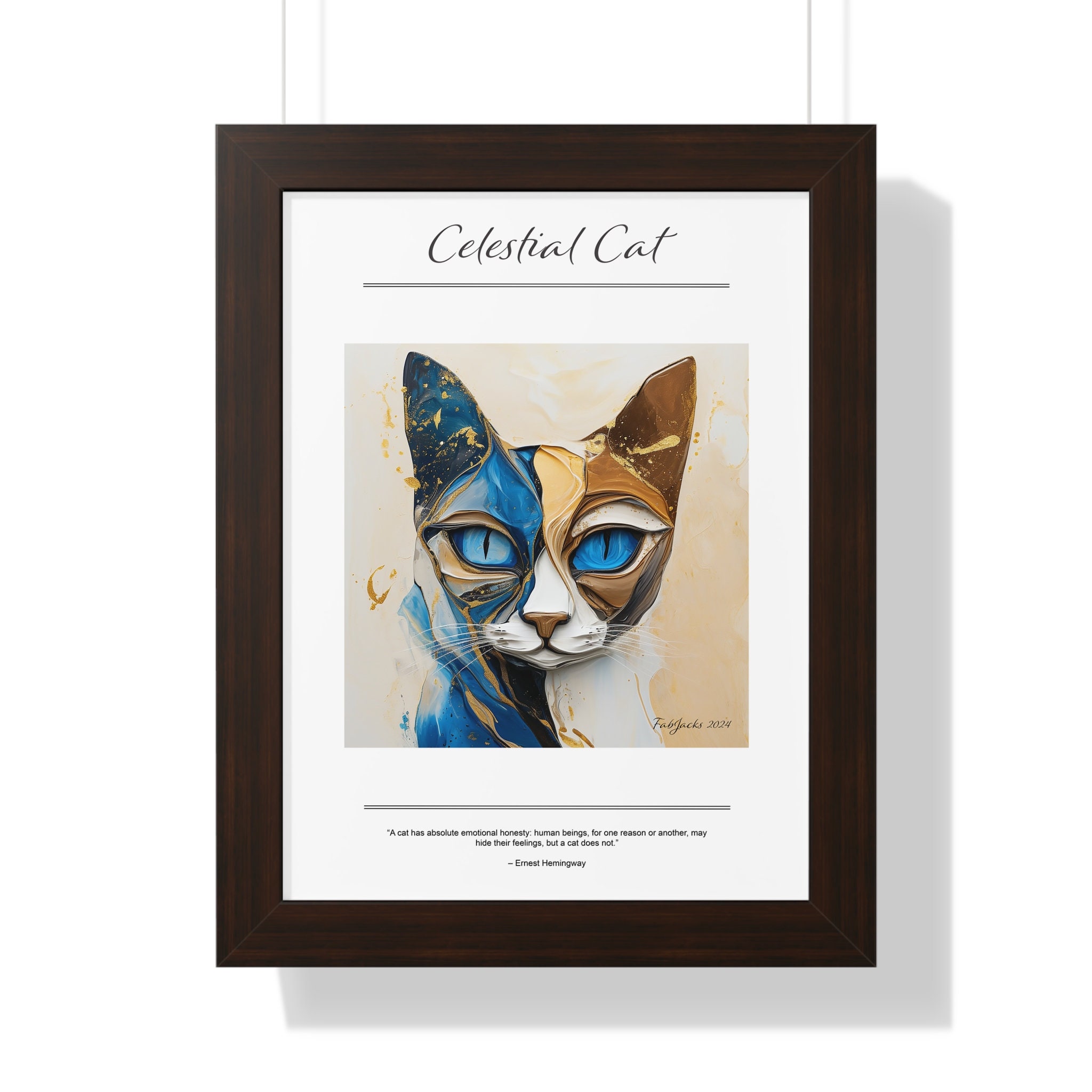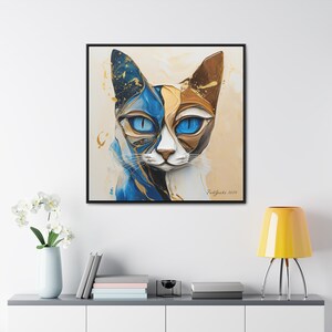 A mesmerizing abstract cat image, painted in fluid art style, swirls with harmonious tones of blue, beige, and gold, evoking a sense of ethereal movement and mystical elegance. Securely framed in one of three colors (black, white, or walnut), these premium posters exhibit their varied contents through archive-worthy photo paper and ink. For easy hanging, there’s a backing hardware piece. The framing is made of MDF. Further ensuring durability, the bordering is low maintenance and resistant to swelling and warping.
