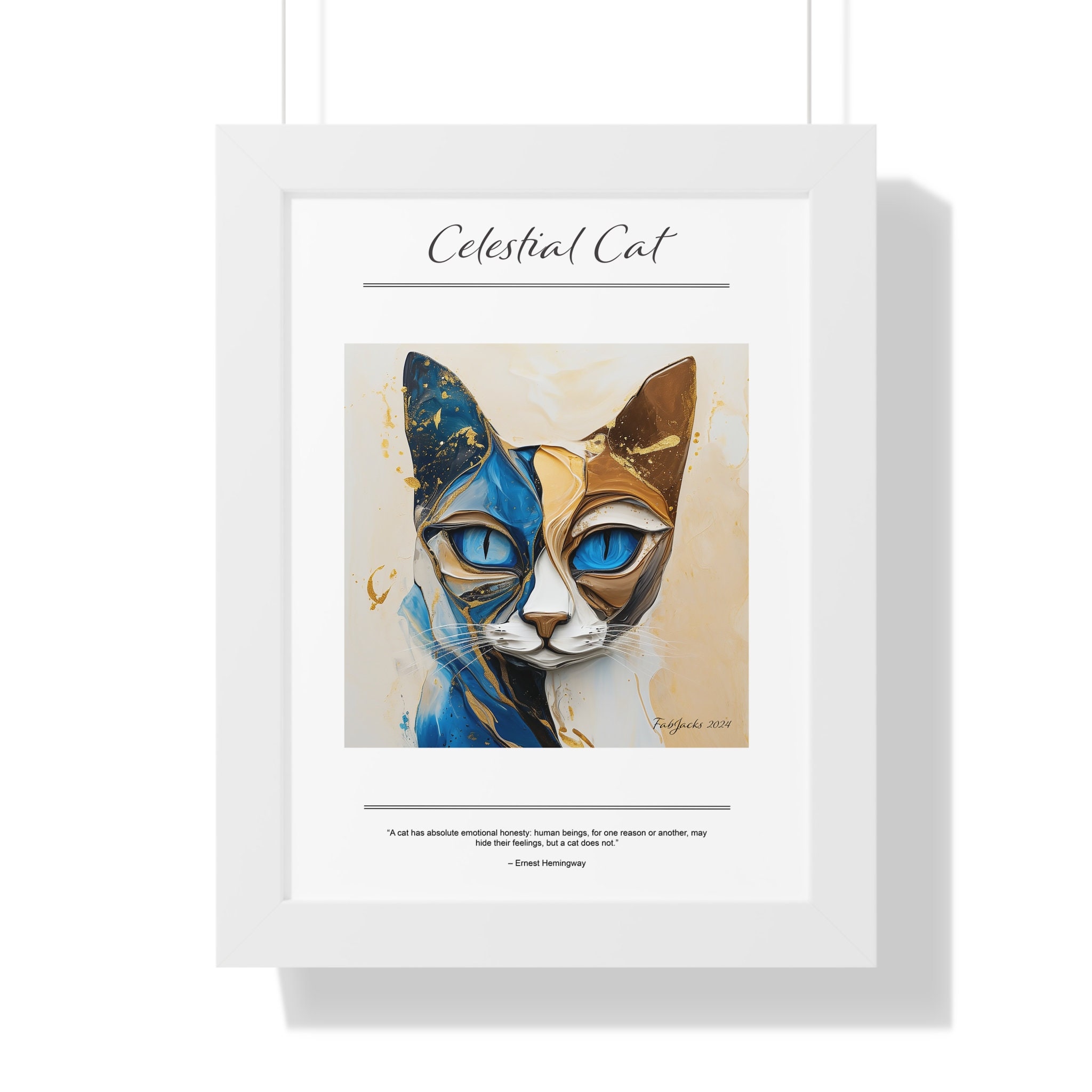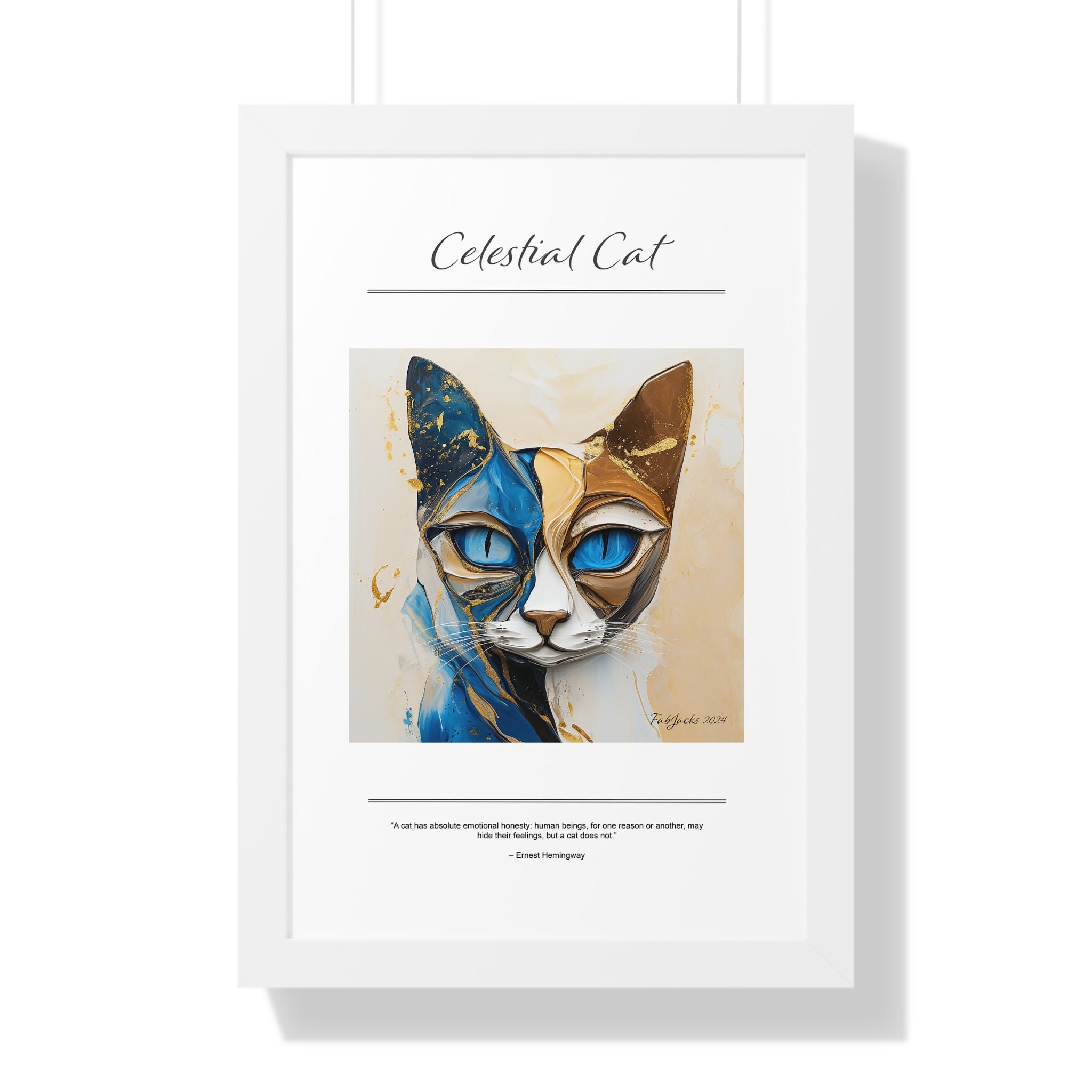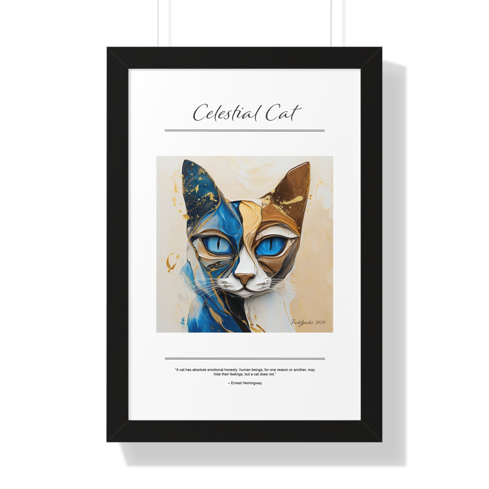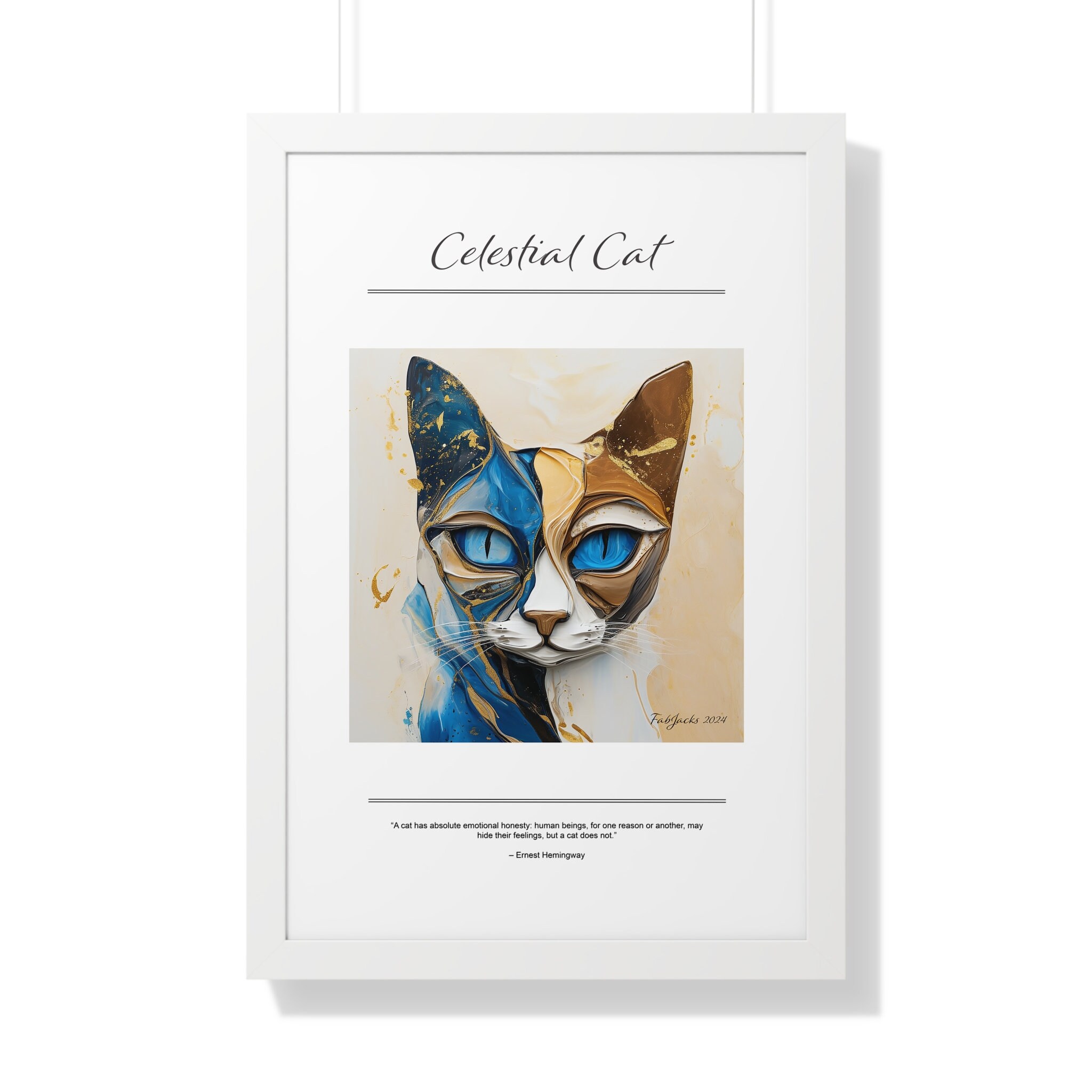 A mesmerizing abstract cat image, painted in fluid art style, swirls with harmonious tones of blue, beige, and gold, evoking a sense of ethereal movement and mystical elegance. Securely framed in one of three colors (black, white, or walnut), these premium posters exhibit their varied contents through archive-worthy photo paper and ink. For easy hanging, there’s a backing hardware piece. The framing is made of MDF. Further ensuring durability, the bordering is low maintenance and resistant to swelling and warping.