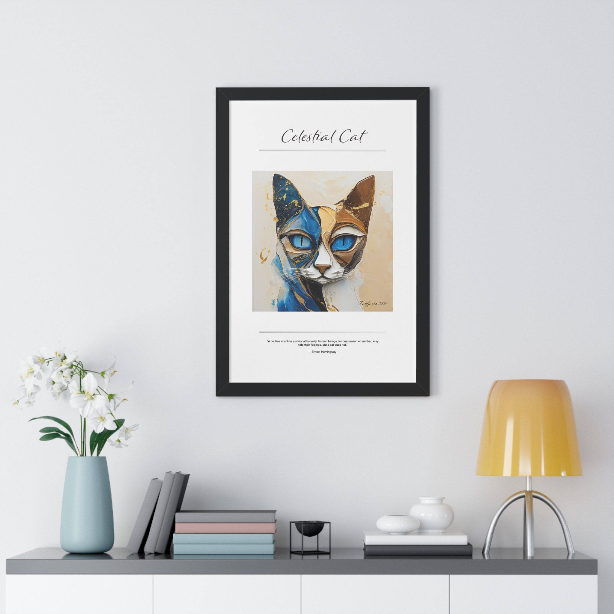 Celestial Cat Framed Vertical Poster, original art printed on high quality artist paper, framed in white, black or walnut, a great gift.