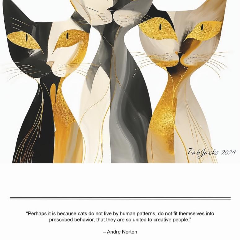 The Celestial Purrs artwork is a captivating piece of modern art, predominantly using neutral tones with subtle yet striking gold accents. At the center of the composition are three cats, each characterized by their large, expressive eyes that draw the viewer in. The neutral palette provides a calming backdrop, while the gold accents add a touch of elegance and sophistication, making the cats' eyes sparkle with life.